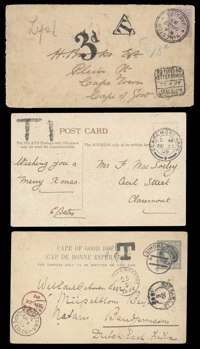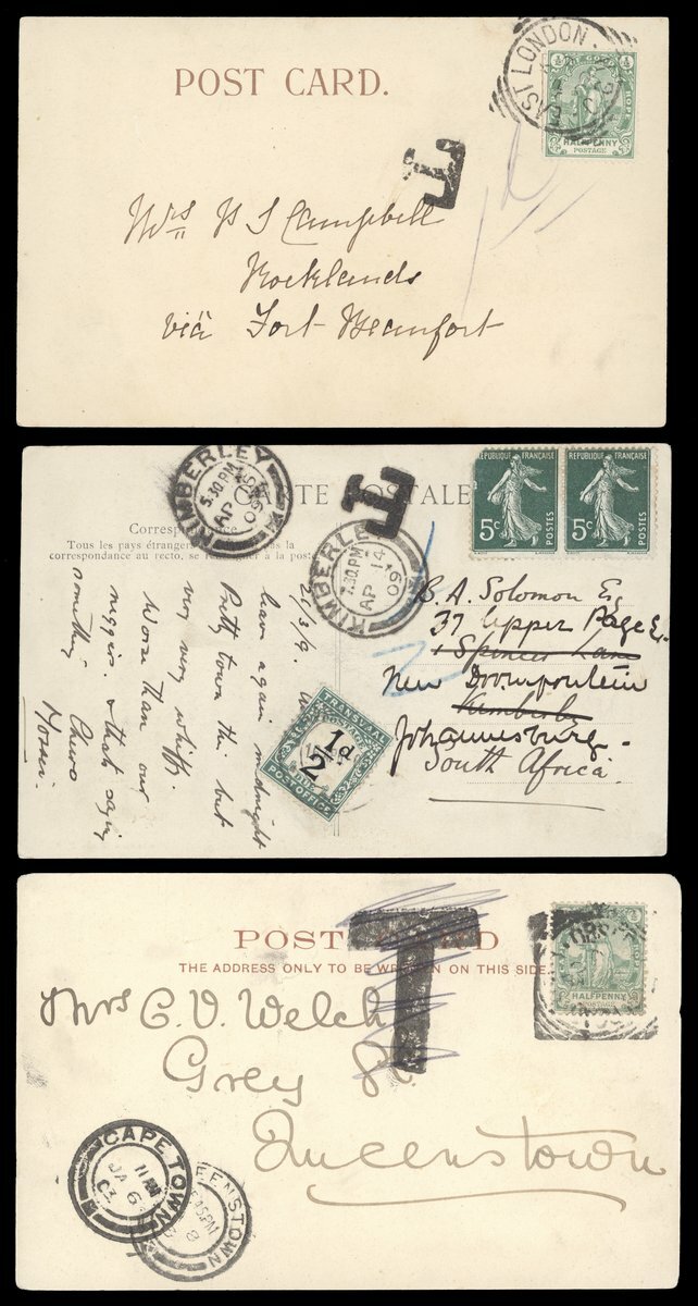 1889-1909 envelopes (4), 1½d. stationery card and picture postcards (8), variously addressed and franked (one from Jamaica)showing a range of markings including unframed "T" (3, one bearing Transvaal ½d. Postage Due), large "T 1", oval-framed