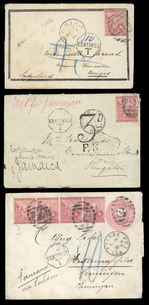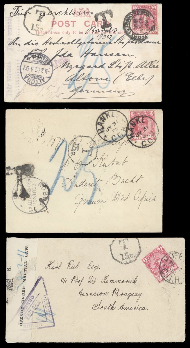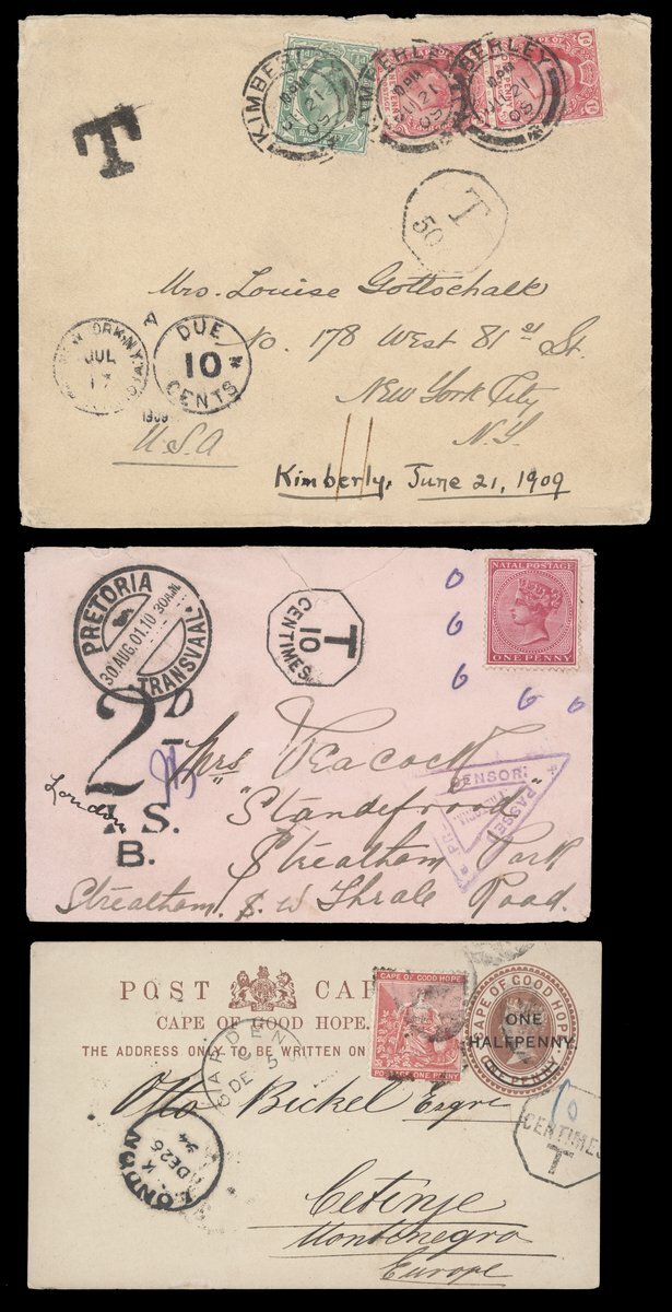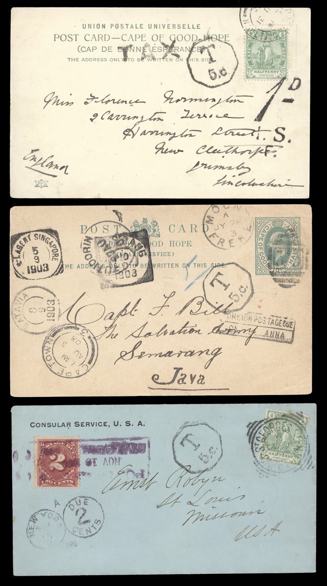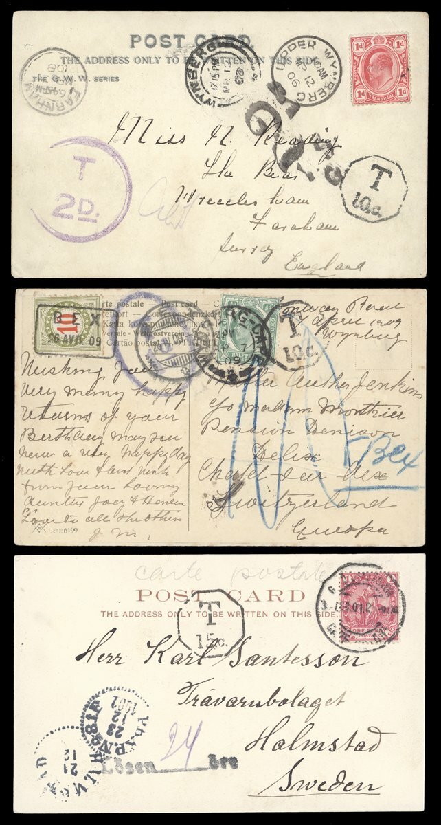 1894-1909 envelopes (11), 1d. stationery envelopes (2), Souvenier Letter Card, stationery cards (3) and picture postcards (7), predominantly outgoing including to Australia, Holland (2), Germany (4), Jamaica, Netherlands East Indies Paraguay, Sweden Switzerland (2) and USA (2), handstamps including octagonal-framed "T" for 5c. (3, one also showing Type SP35), 10c. (3), 15c. (6), 20c., 25c. (2), 30c. (2) and 50c., octagonal-framed