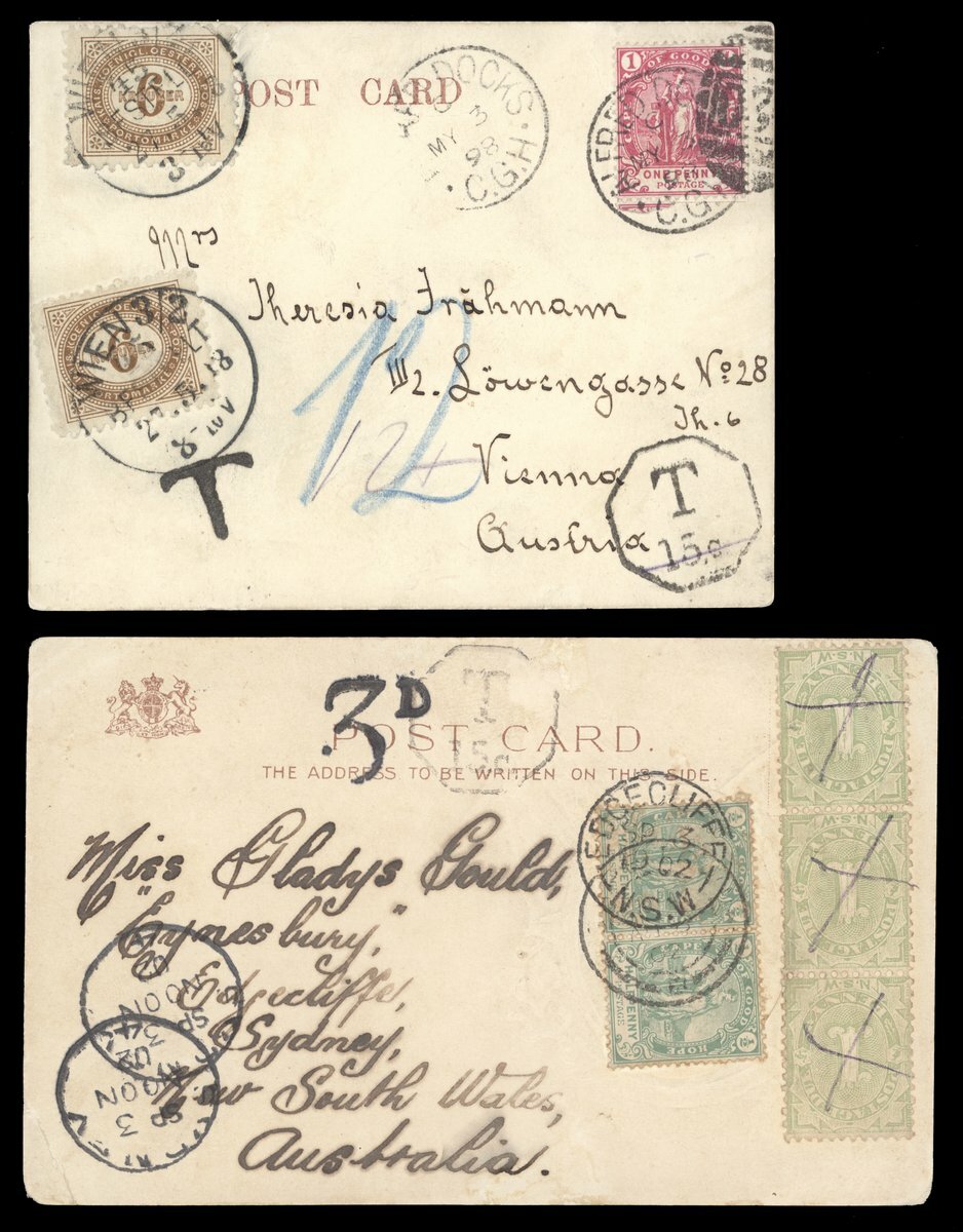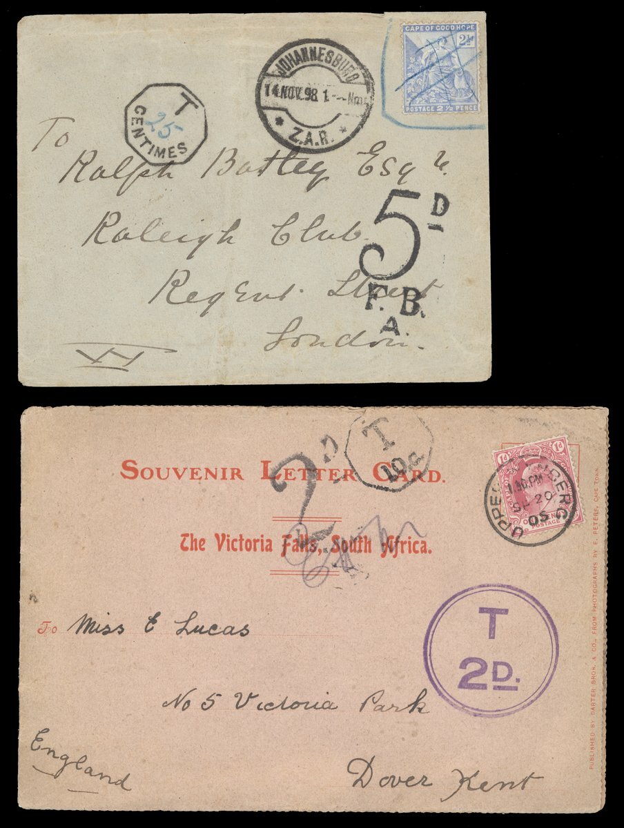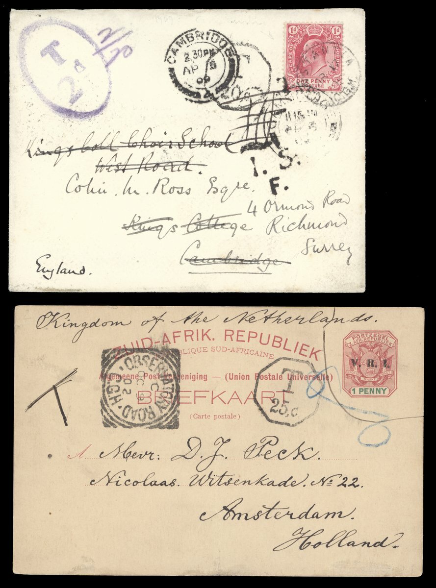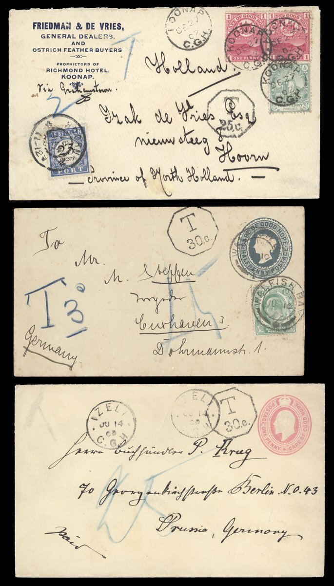 1894-1909 envelopes (11), 1d. stationery envelopes (2), Souvenier Letter Card, stationery cards (3) and picture postcards (7), predominantly outgoing including to Australia, Holland (2), Germany (4), Jamaica, Netherlands East Indies Paraguay, Sweden Switzerland (2) and USA (2), handstamps including octagonal-framed "T" for 5c. (3, one also showing Type SP35), 10c. (3), 15c. (6), 20c., 25c. (2), 30c. (2) and 50c., octagonal-framed