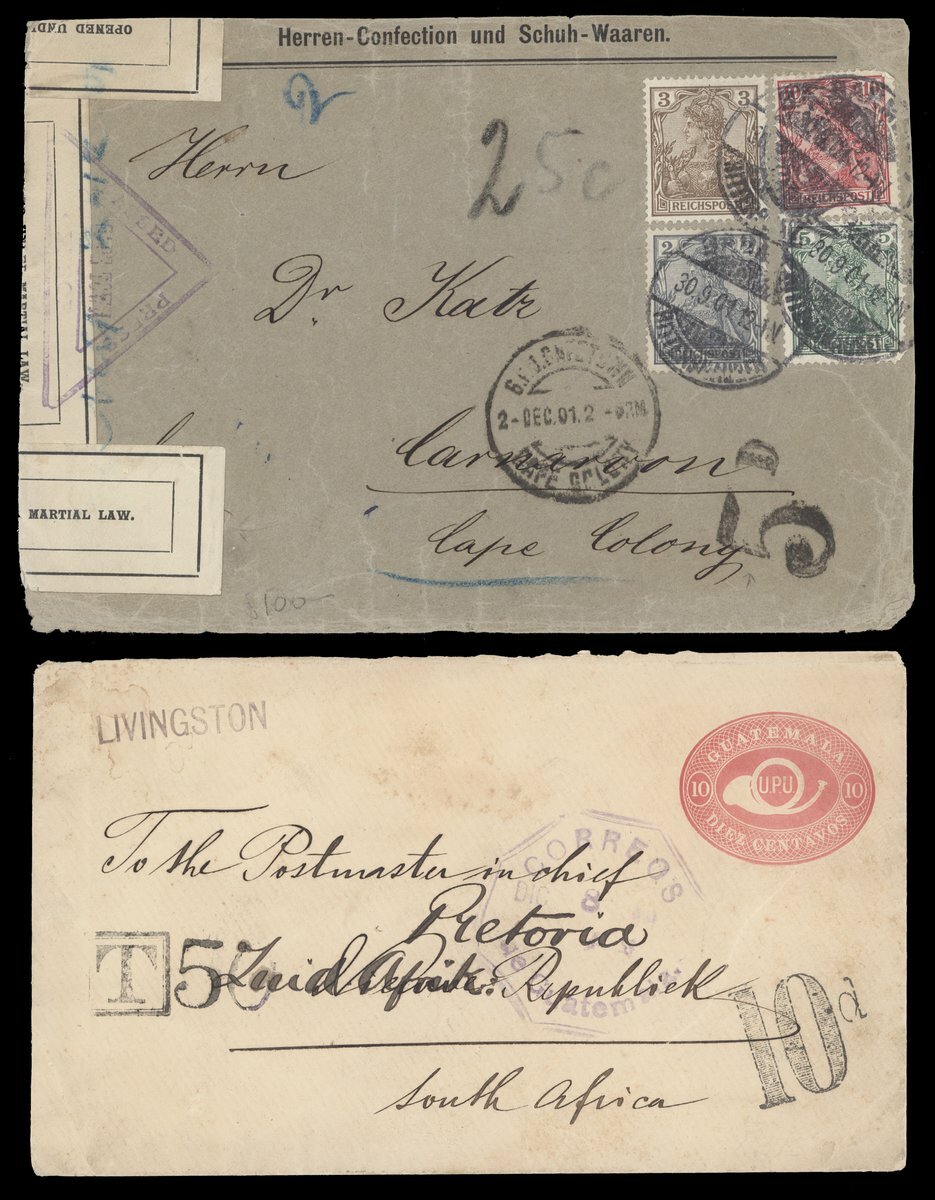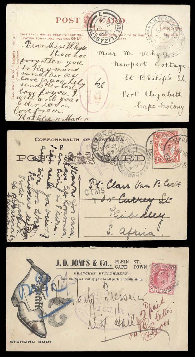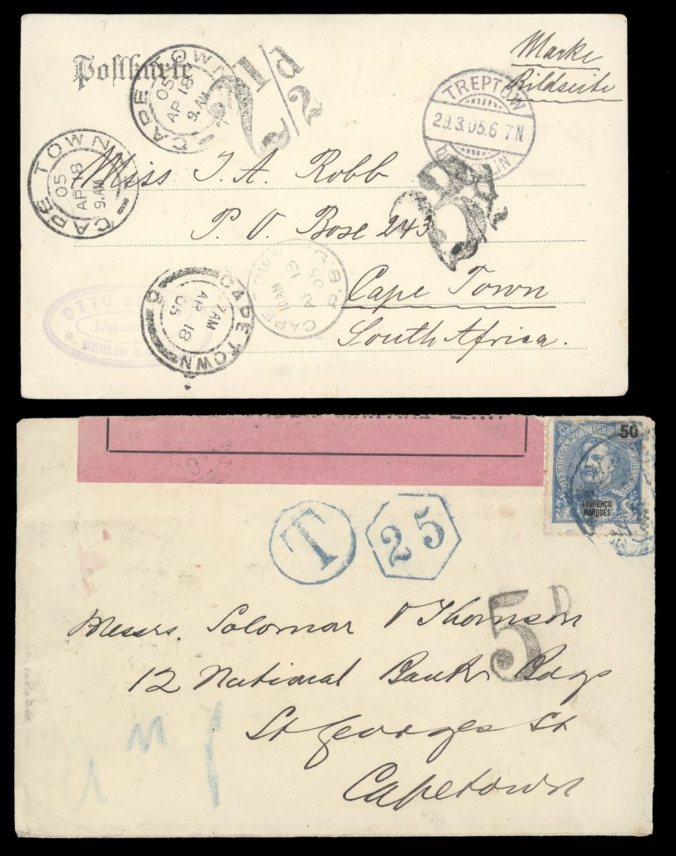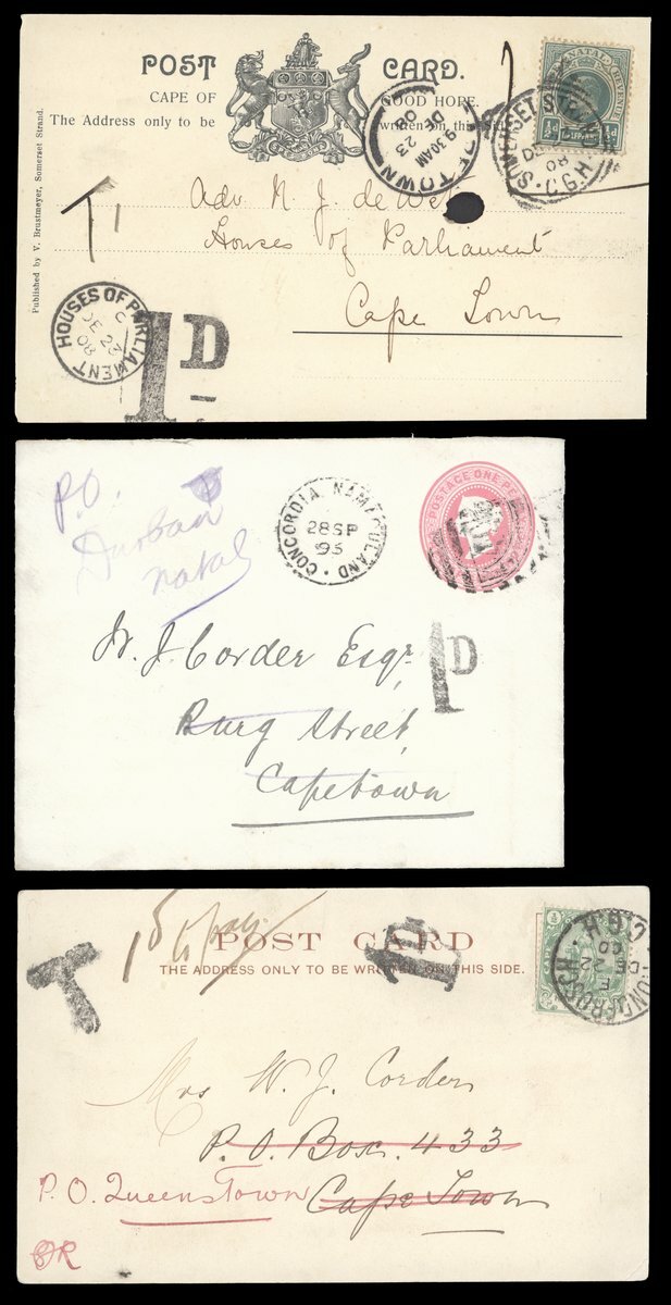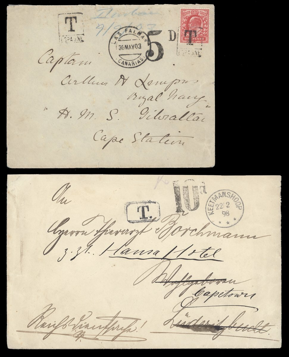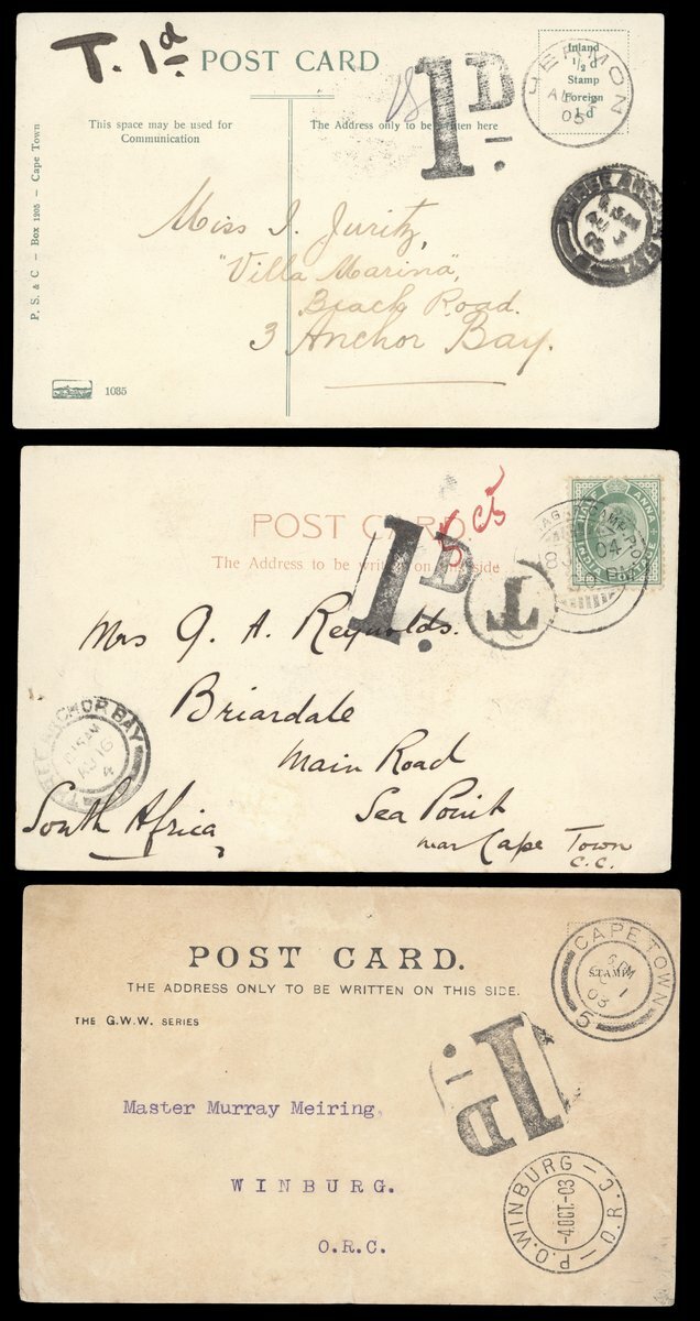 1895-1908 envelopes (6), 1d. stationery envelope and picture postcards (8) including mail from Canary Is., Germany (2), Guatemala, India, Mozambique, Queensland and South West Africa, all with tax handstamps 1d. (8) including Types PD3 (2), PD5 (4) and PD7 (2), 2d. Type PD13, 2½d. Type PD15), 5d. Type PD19 (3) and 10d. (2, unlisted); mostly fine strikes