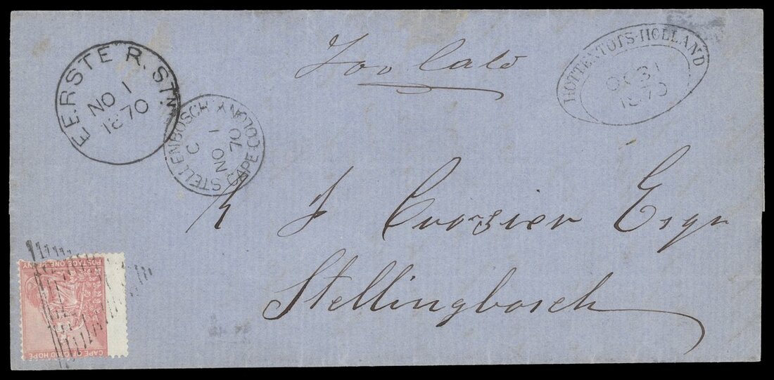1870 (31 Oct.) entire from Hottentots-Holland to Stellenbosch, bearing 1d. tied by triangular obliterator, showing despatch,
