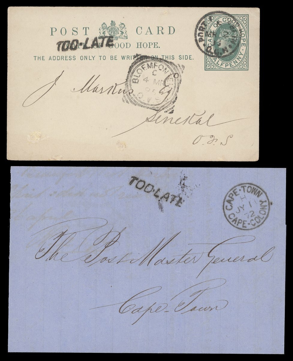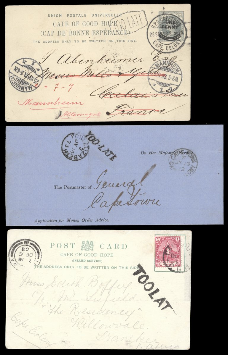 1872 (1 July) locally addressed entire at Cape Town, 1873 (14 July) entire (no side flaps) from Port Elizabeth, 1895 (2 Mar.) ½d. stationery card from Port Elizabeth to OFS,1898 (28 Sept.) 1d. on 1½d. stationery card from Cape Town to France and re-addressed to Germany, and 1903 (Dec.) picture postcard from Cape Town to Transkei, all showing Too Late handstamps with Types SP 7 (2), SP 8, SP 16 and a type similar to SP 13 but with