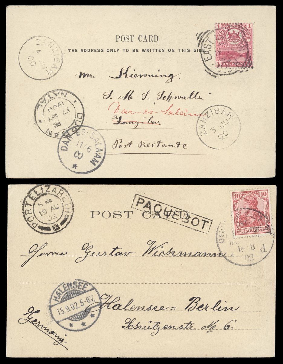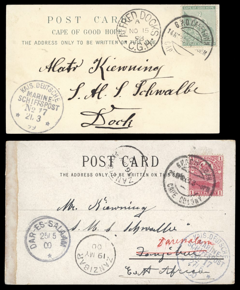 1898 (15 Nov.) and 1900 (24 Apr.) postcards from Cape Town addressed to the S.M.S. "Schwalbe" franked at ½d. and 1d., the first with Alfred Docks arrival c.d.s., the second to Zanzibar and redirected to Dar-es-Salaam, both showing