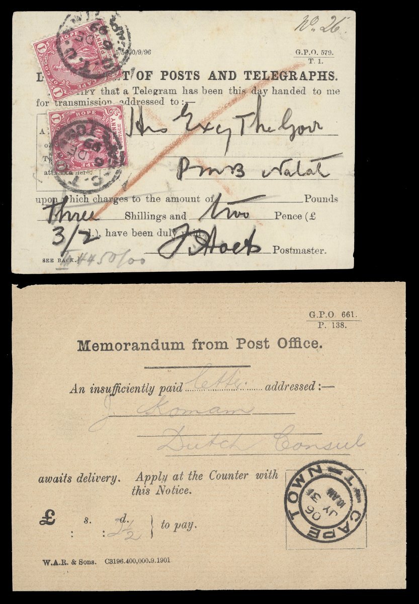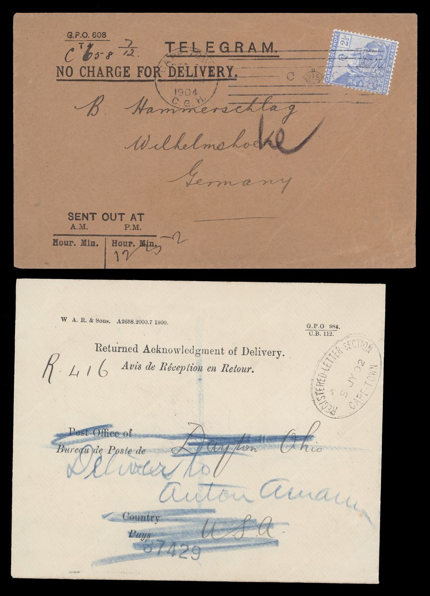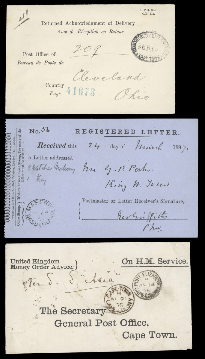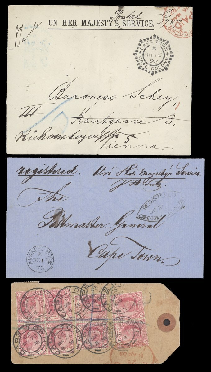 An assortment including 1873 entire gegistered to Cape Town showing fine Amadel Boom c.d.s.; 1875 (22 May) envelope from Resident Magistrate at Fort Beaufort to Grahamstown; 1892 (16 Mar.) envelope to Vienna with Cape Town Compass Point d.s.; 1900 Parcel Post and Post and Telegraphs receipts; 1904 Telegram envelope from Cape Town to Germany franked at 2½d.; and 1905 Parcel Post label from Cape Town to England bearing KE 1d. (2) on one side with another eight on the other side tied by