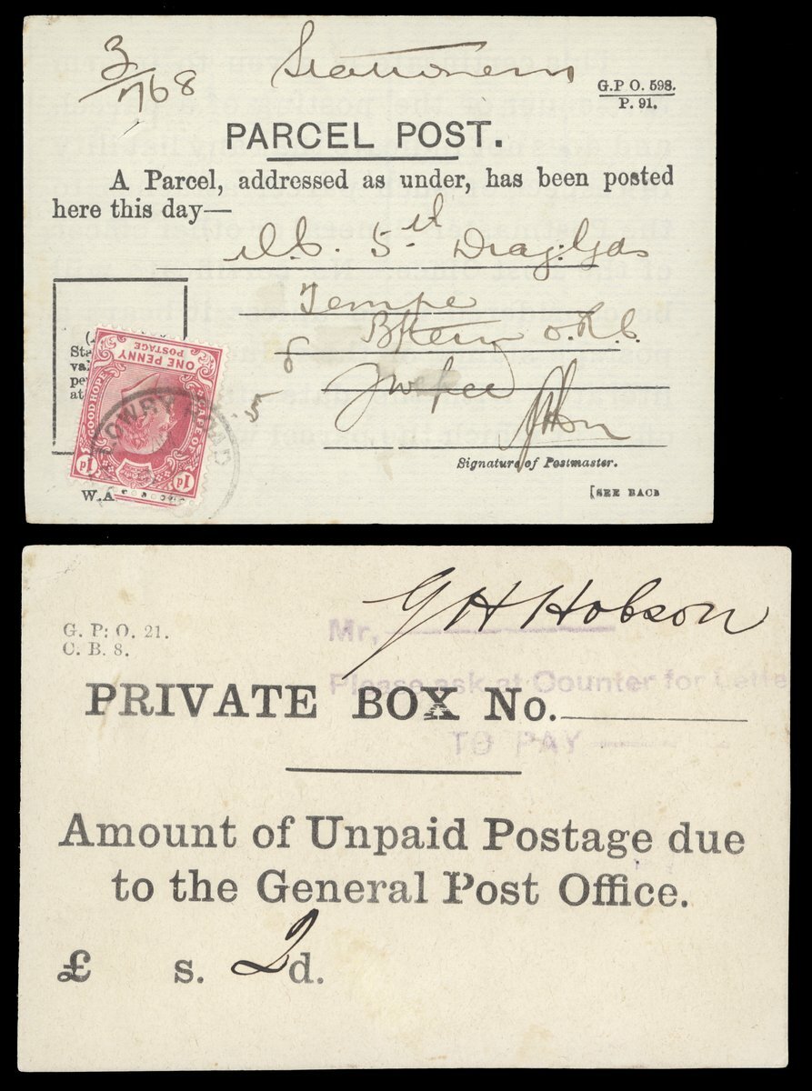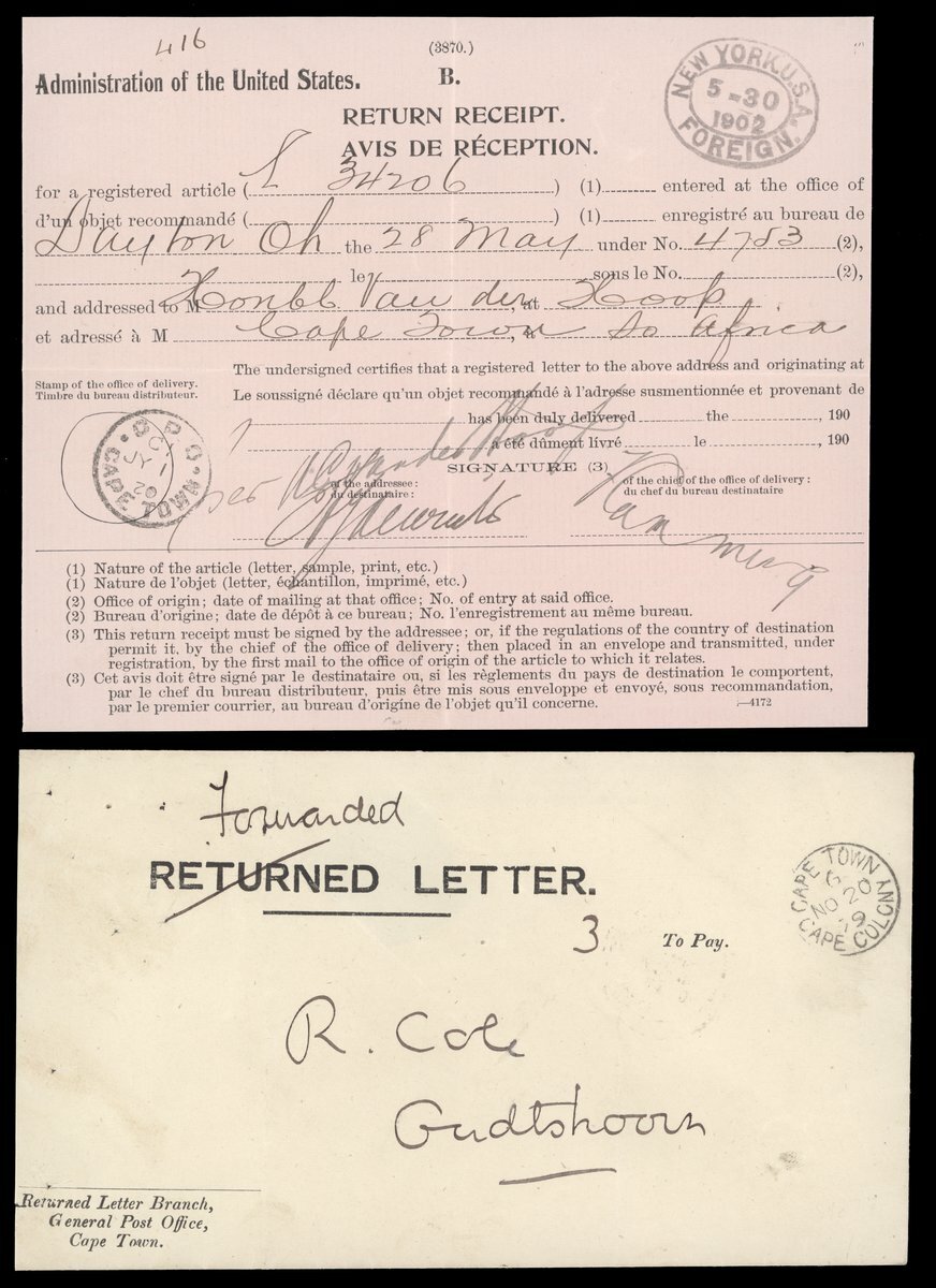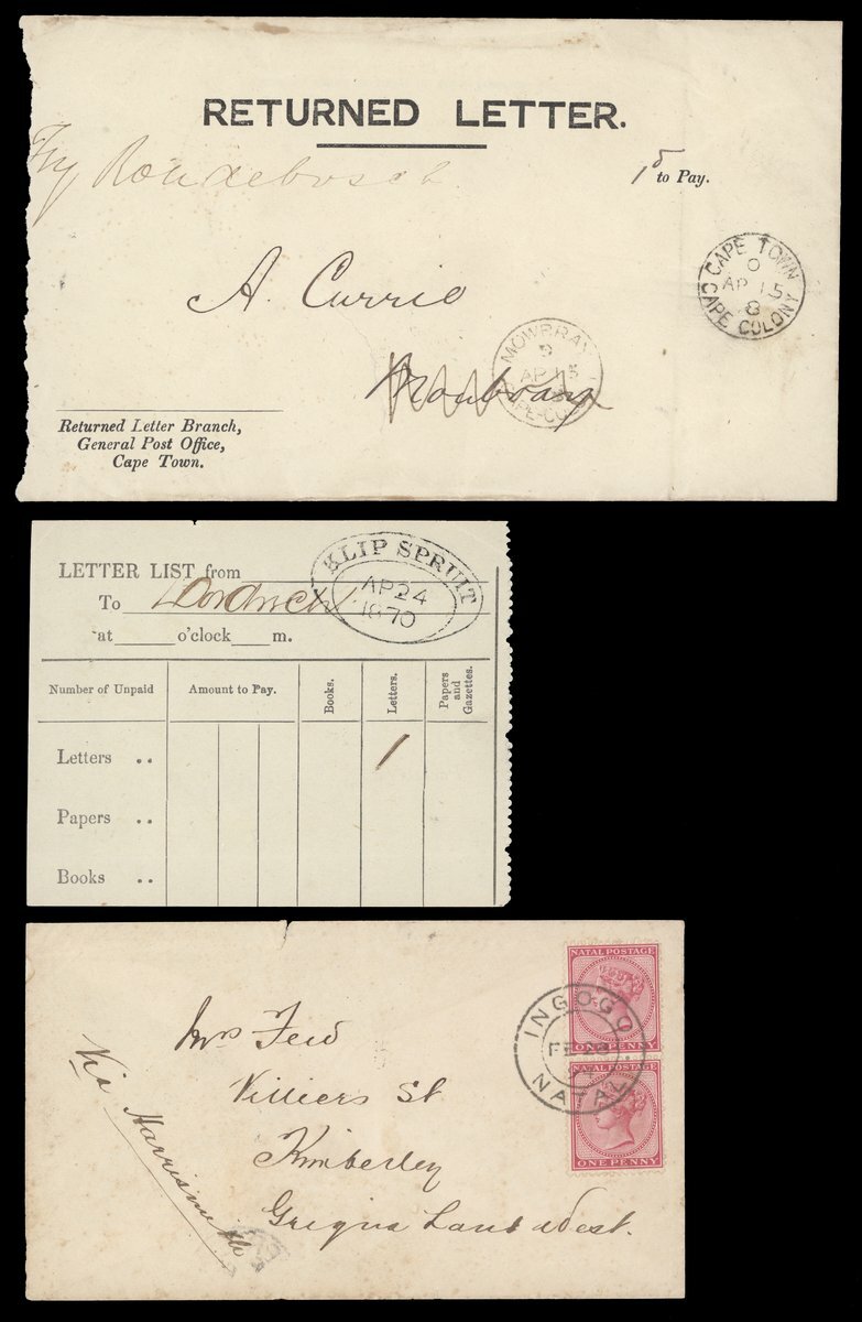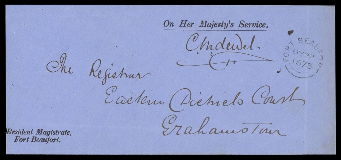 An assortment including 1873 entire gegistered to Cape Town showing fine Amadel Boom c.d.s.; 1875 (22 May) envelope from Resident Magistrate at Fort Beaufort to Grahamstown; 1892 (16 Mar.) envelope to Vienna with Cape Town Compass Point d.s.; 1900 Parcel Post and Post and Telegraphs receipts; 1904 Telegram envelope from Cape Town to Germany franked at 2½d.; and 1905 Parcel Post label from Cape Town to England bearing KE 1d. (2) on one side with another eight on the other side tied by