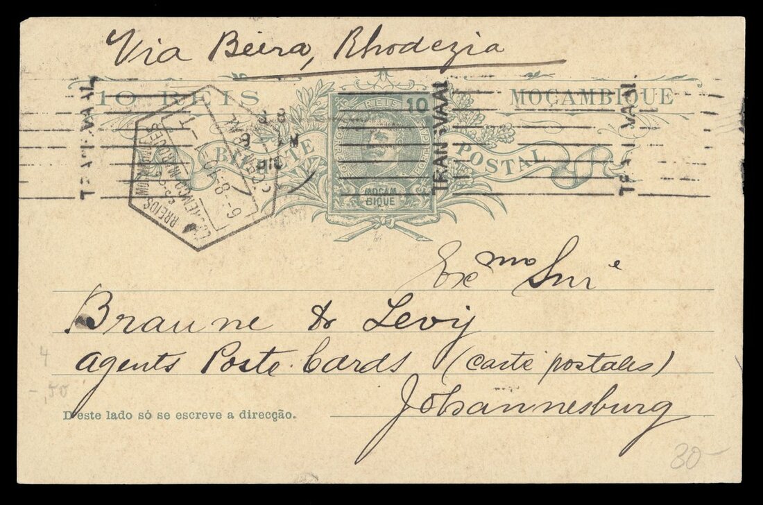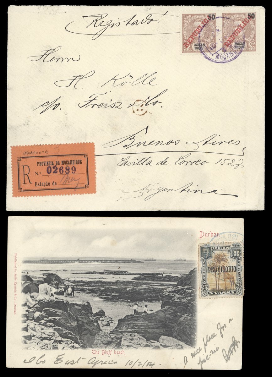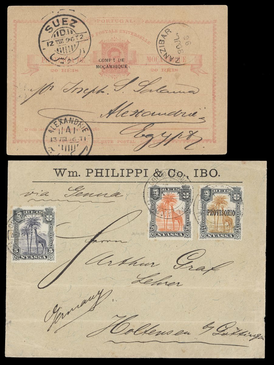 1896 20r. stationery card from Beira to Egypt showing Zanzibar (30.7), Suez (12.8) and Alexandria arrival (13.8) datestamps; 1904 (Feb.) picture postcard from Ibo to Scotland, bearing Nyassa 25r. and showing Zanzibar transit c.d.s.; 1907 (25 Jan.) envelope from Ibo to Germany, marked "via Genoa", bearing Nyassa 5r., 20r. and 25r. and showing Dar-es-Salaam transit d.s. on reverse; 1910 (6 Aug.) 10r. stationery card from Lourenco Marques to Johannesburg, marked "Via Beira, Rhodesia"; and 1911 envelope registered to Argentina and bearing 50r. pair