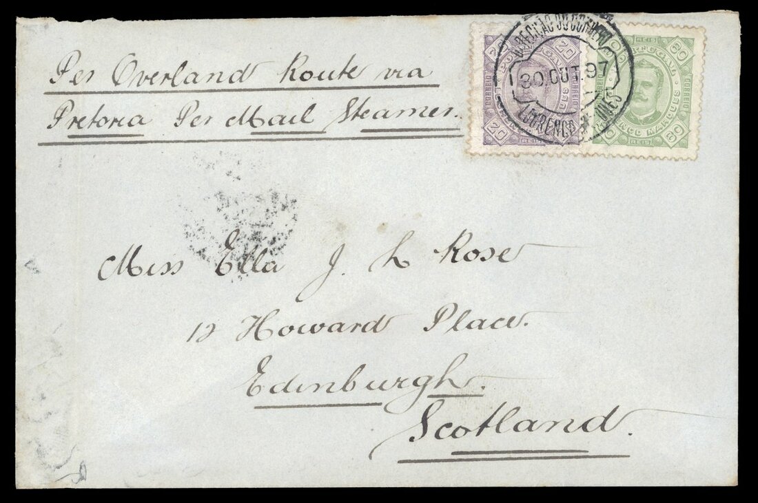 1897 (30 Oct.) envelope from Lourenco Marques to Edinburgh, marked "Per Overland Route via Pretoria Per Mail Steamer", bearing 20r. and 80r. tied by c.d.s. and showing, on reverse, Edinburgh & Newcastle Sorting Tender c.d.s. (22.11); envelope with vertical crease at left. Attractive