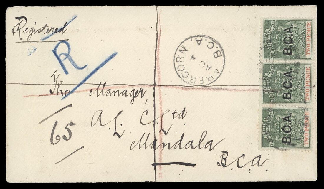 1898 (4 Aug.) envelope registered to Mandala, bearing 1891 2d. strip of three cancelled by light barred numeral, showing fine