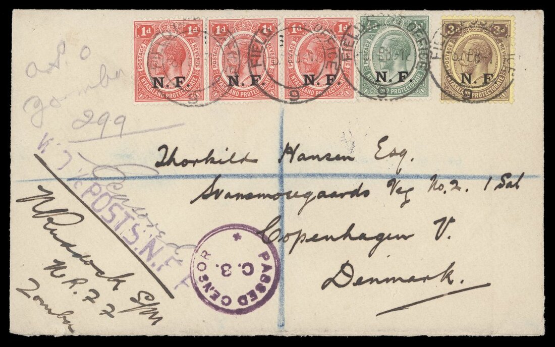 1918 (8 Feb.) envelope registered from Zomba to Denmark, bearing ½d., 1d. strip of three and 3d. tied by