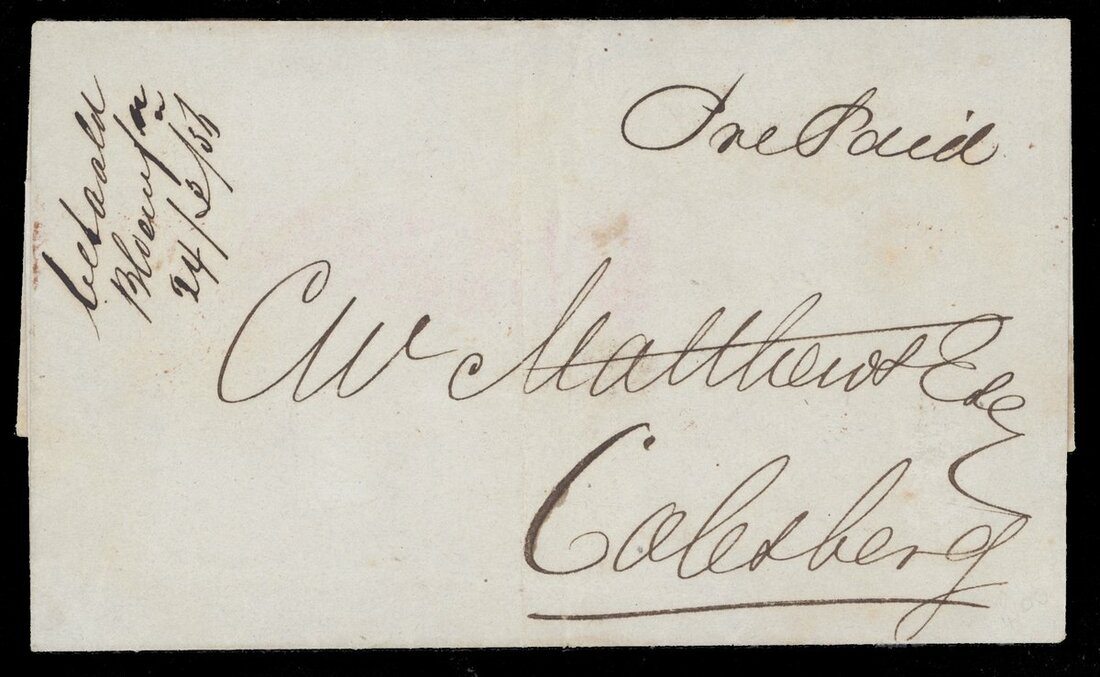 1856 (24 Mar.) entire from Bloemfontein to Colesburg, marked "PrePaid" and with manuscript "betaald Bloemftn 24/3/56" at left, arrival oval d.s. (28.3) on reverse;