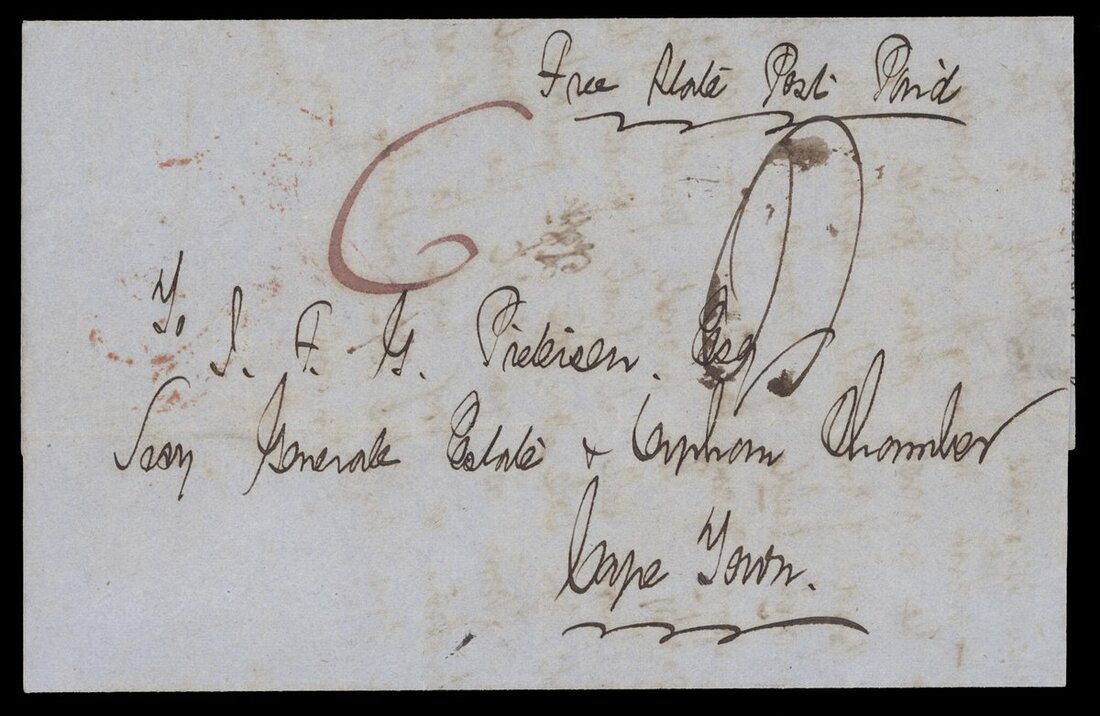 1861 (Apr.) entire (no side flaps) from Bloemfontein to Cape Town, marked "Free State Post Paid", rated "6" in black and in red (Cape 4d. internal rate plus 2d. fine as the postage was not prepaid) and showing, on reverse, red arrival datestamp (17.4)