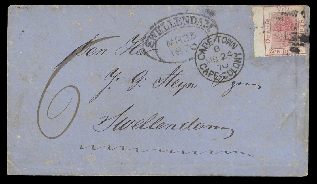1870 envelope to Swellendam, bearing 6d. with wing-margin at left (faults) cancelled by unclear and messy obliterator, showing manuscript "6" charge mark, Cape Town (24.3) and arrival (25.3) datestamps; the envelope with some light age-spotting