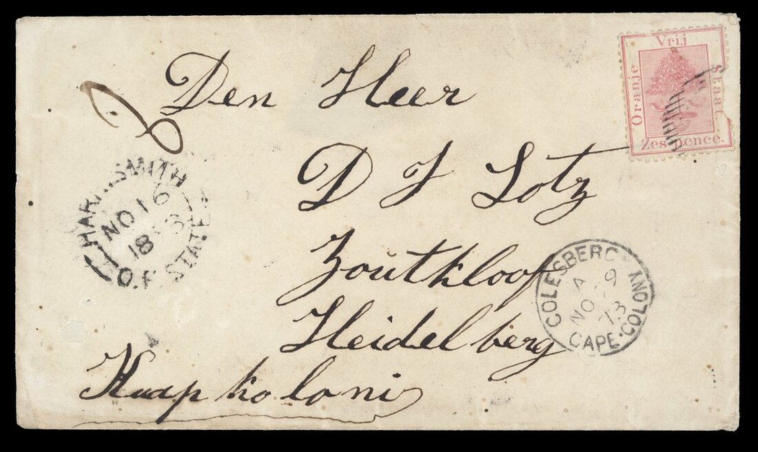 1873 (16 Nov.) envelope from Harrismith to Heidelburg, bearing 6d. (damaged) tied by unclear barred oval, showing manuscript "8" charge mark, despatch and Colesburg (29.11) c.d.s. with Bloemfontein transit d.s. (22.11) on reverse. Photo