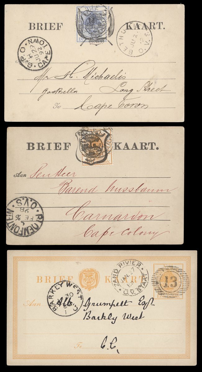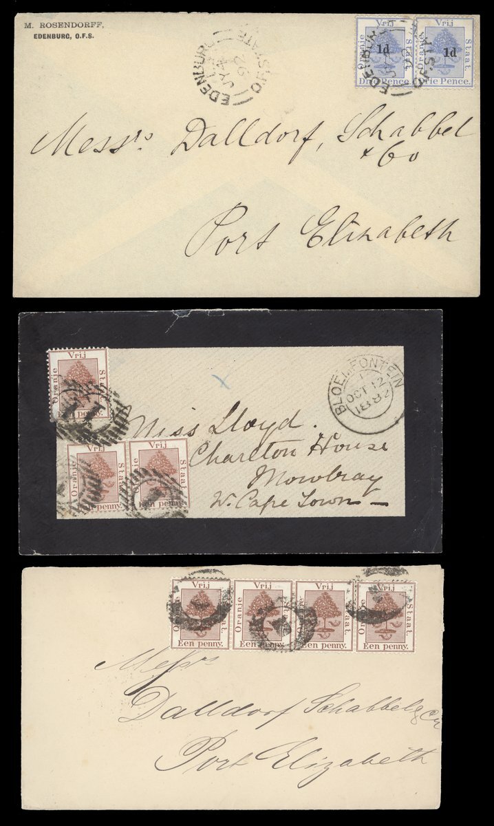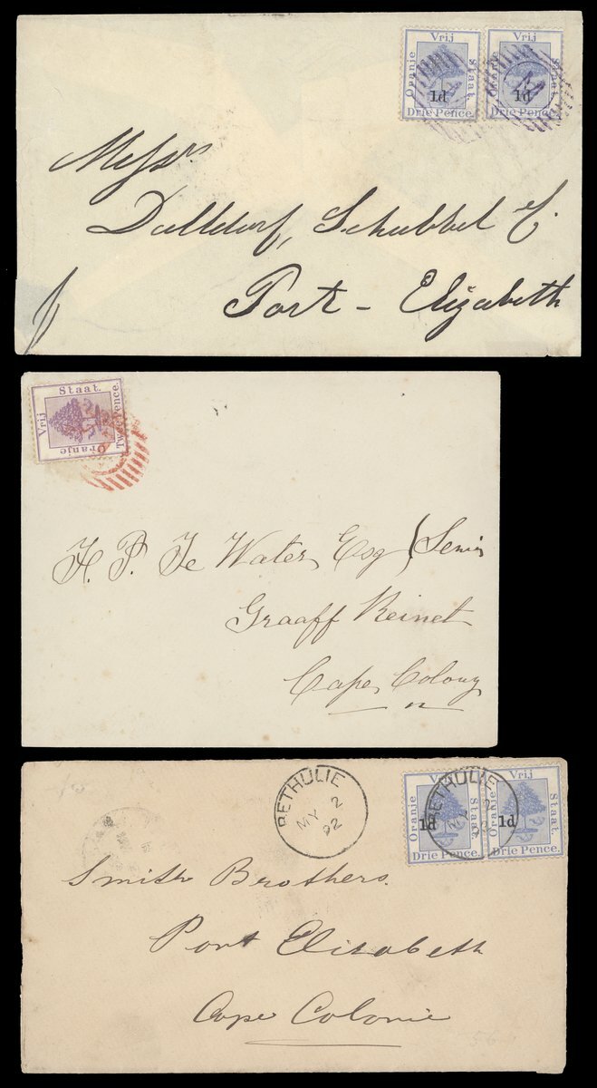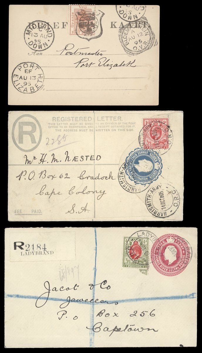 1879-1905 envelopes (13), 1d. stationery envelope (registered and uprated 4d.), 4d. registered envelope (uprated with 1d.) and stationery cards (6), variously addressed, the envelopes with frankings of 1d. (6, one with arrival framed