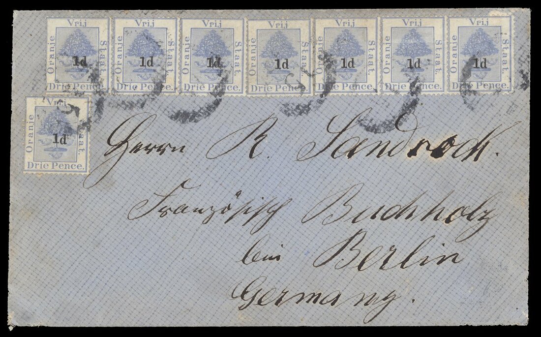 1893 (27 Feb.) envelope from Bethany to Berlin, bearing 1890-91 1d. on 3d. ultramarine (8, one with raised "1") all cancelled "15" in oval of bars, Bloemfontein squared-circle datestamp and arrival c.d.s. (21.3) on reverse; the envelope slightly soiled