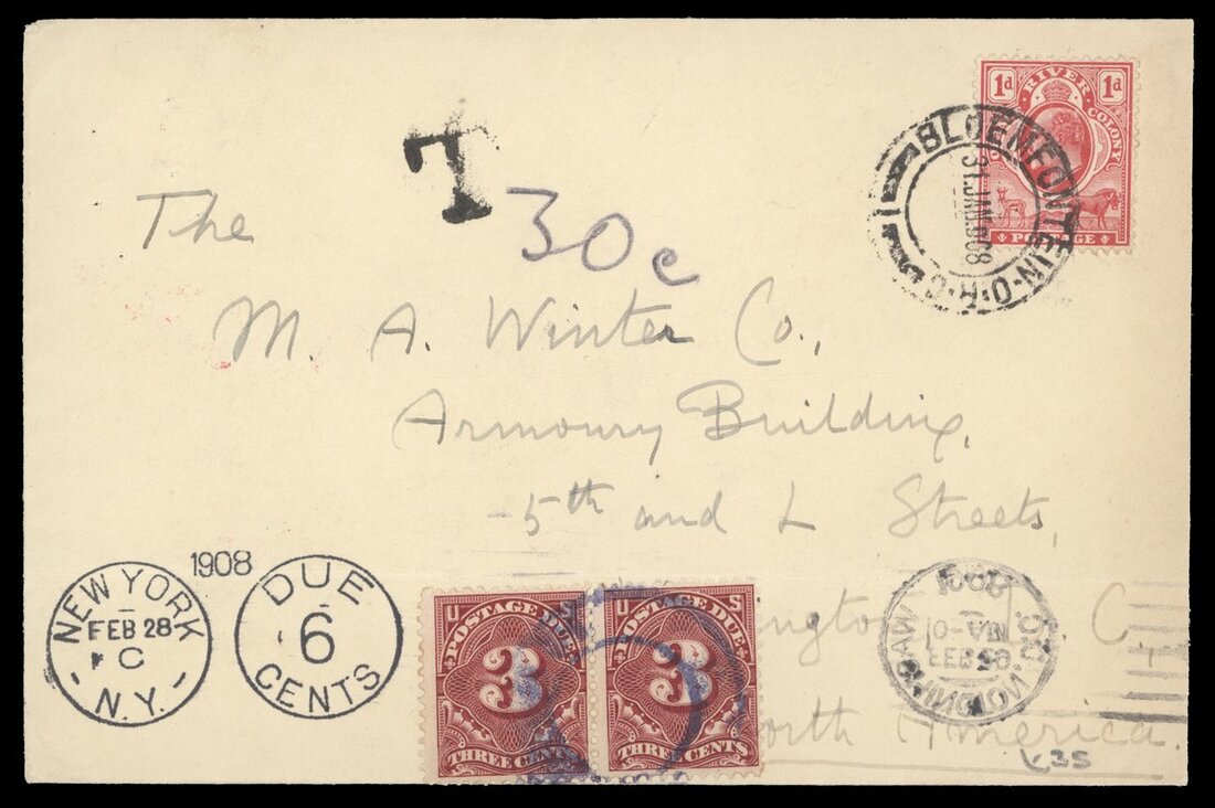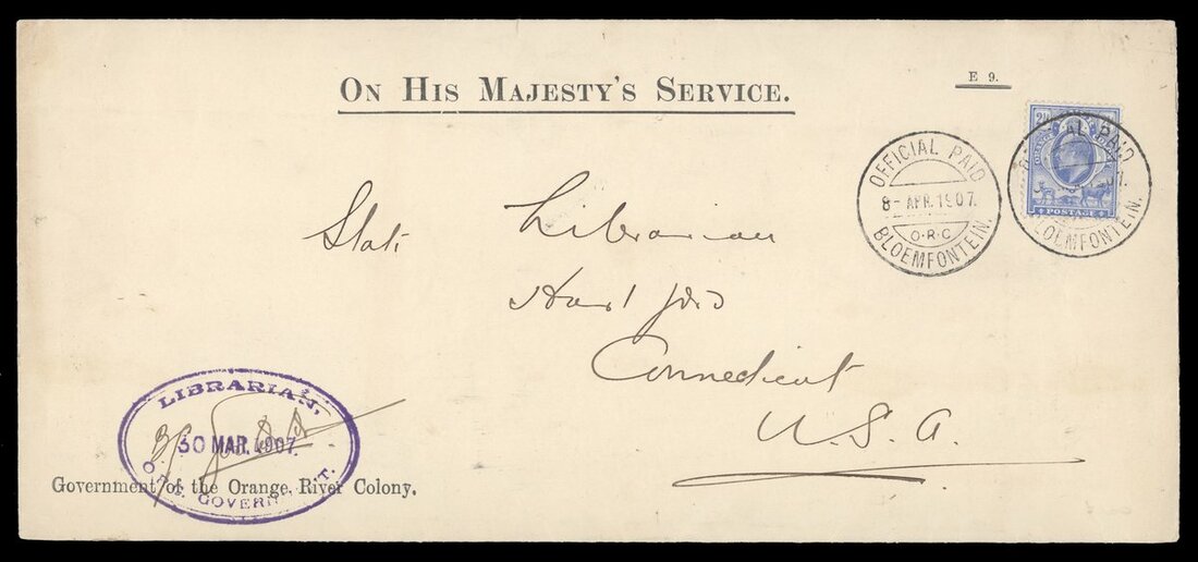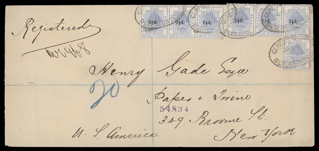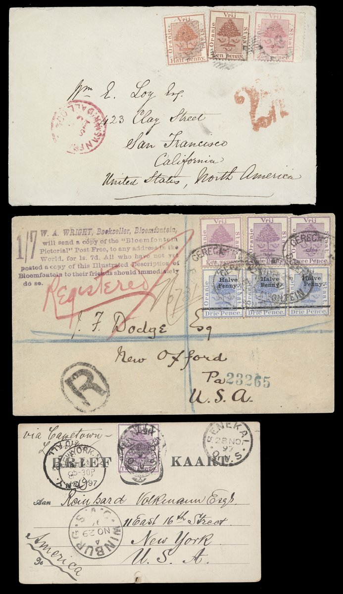 1887 (Aug.) envelope from Philoppolis to San Francisco, franked at 7½d. and showing red "2½d" accountancy h.s.; 1895 envelope registered from Bloemfontein to New York franked at 1/7d.; 1897 (Nov.) 2d. stationery card from Senekal to New York; 1899 envelope registered from Bloemfontein to Pennsylvania franked at 7½d.; 1907 (8 Apr.) OHMS envelope from Bloemfontein to Connecticut franked at 2½d.; and 1908 envelope from Bloemfontein to Washington, franked at 1d., showing tax h.s. and with US Postage Due 3c. pair. A good lot