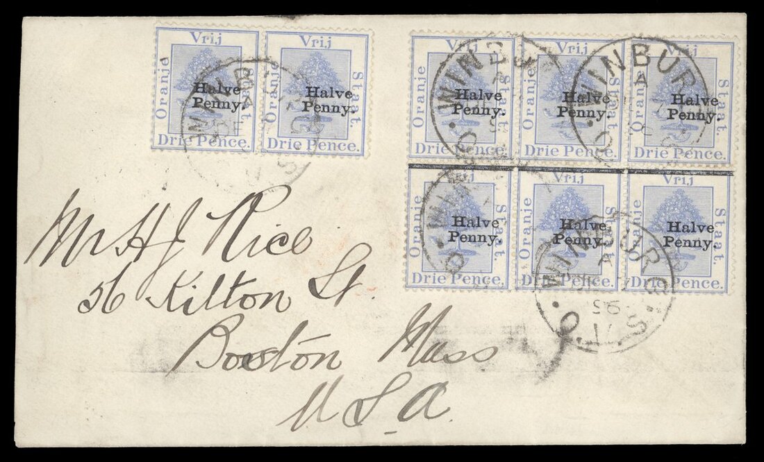 1896 (7 Dec.) envelope from Winburg to Boston, bearing 1896 "Halve/Penny." on 3d. block of six and a pair with five showing bar omitted, all cancelled by c.d.s. and showing, on reverse, New York and arrival (7.1) datestamps