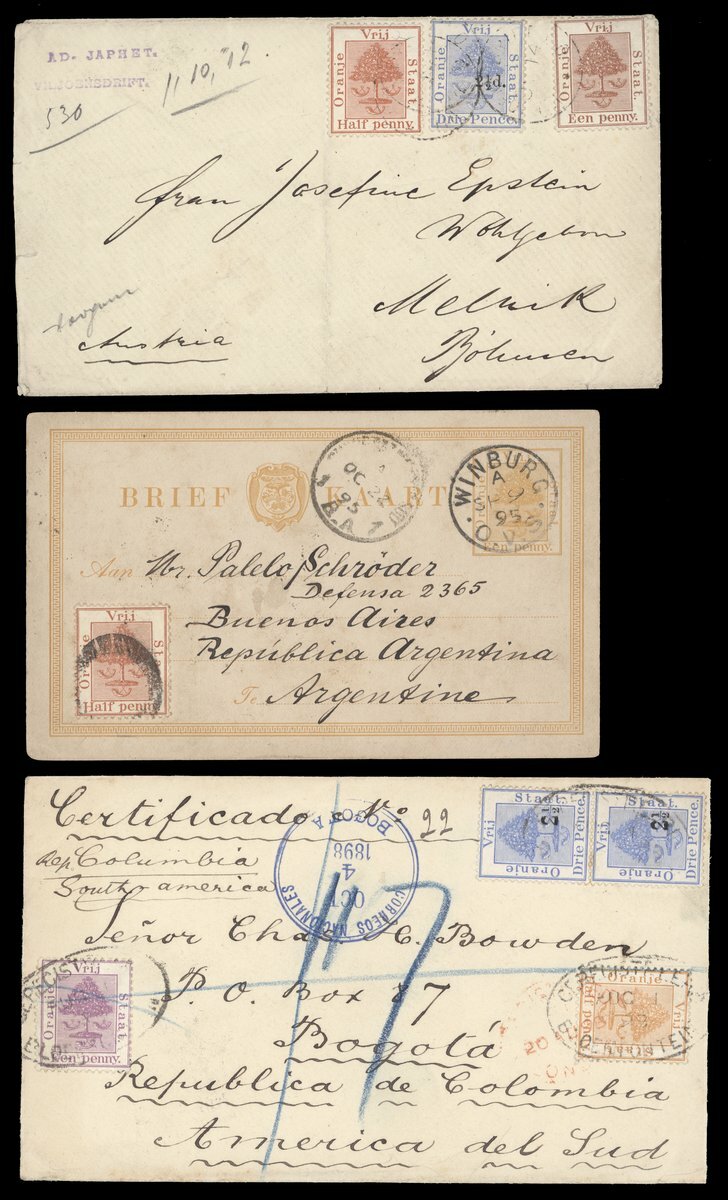 1894 (July) envelope (light central vertical fold) to Bolivia, franked at 4d. and showing Cape Town and London transit datestamps on reverse; 1895 (9 Sept.) 1d. stationery card from Winburg to Argentina and uprated ½d.; and 1898 (1 Aug.) envelope registered from Bloemfontein to Colombia, franked at 6½d. and showing Cape Town and London transit datestamps. Scarce destinations