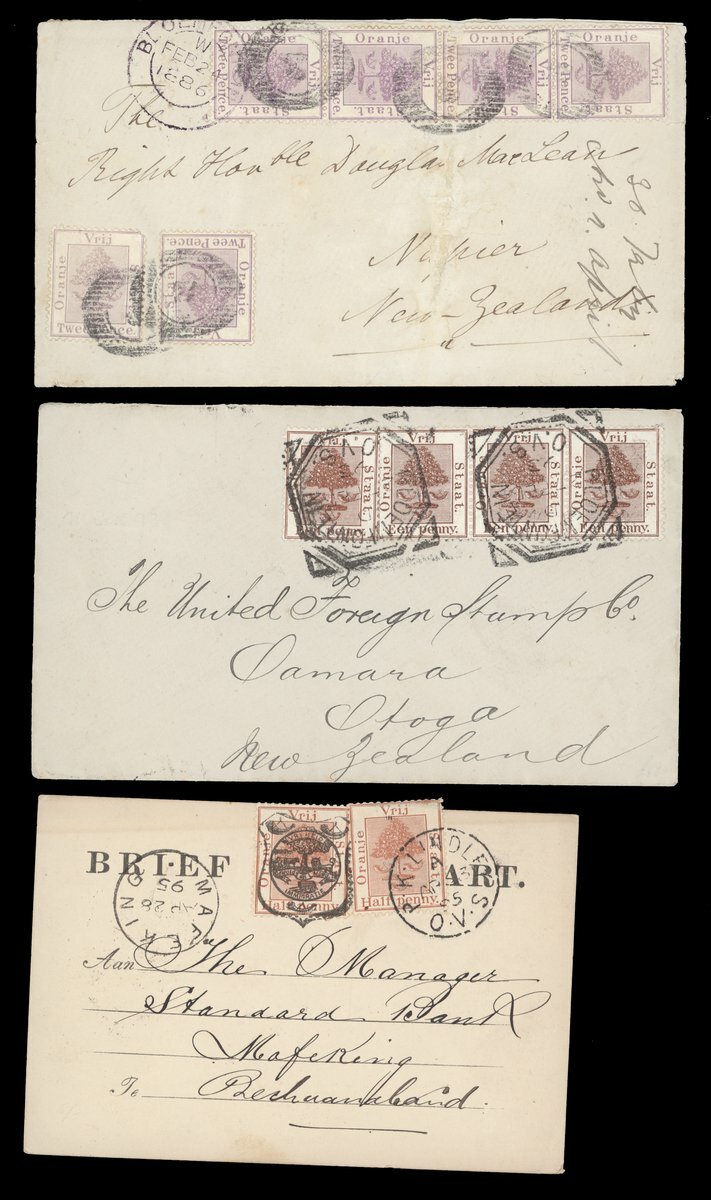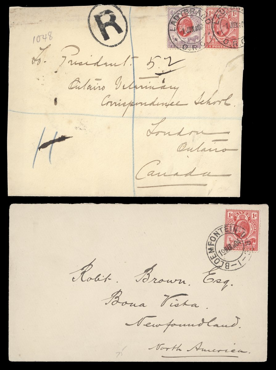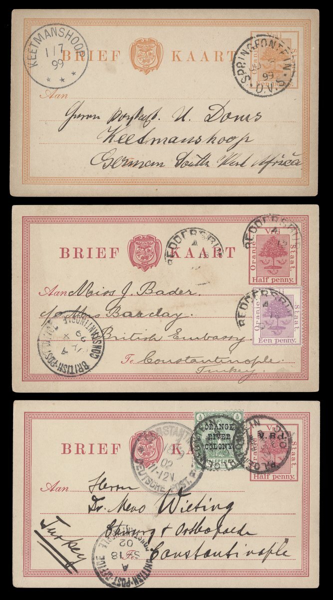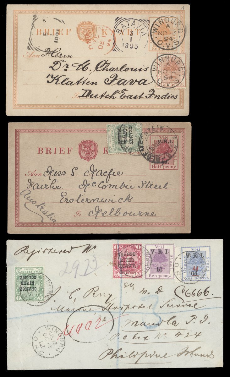 1886-1907 comprising 1886 and 1893 envelopes franked at 6d. and 4d. respectively 1894 1d. card uprated with ½d. to Netherlands East Indies; 1895 ½d. card uprated ½d. to Bechuanaland; 1899 1d. card to German South West Africa; 1899 ½d. card uprated with 1d. and 1902 ½d. card uprated with ½d. to Turkey; 1902 envelope registered to Phillipine is. franked at 6½d.; 1904 envelope to Newfoundland franked at 1d. and 1907 envelope registered to Canada franked at 7d.; and 1903 ½d. stationery card uprated with ½d. to Australia. A good group well worth careful viewing