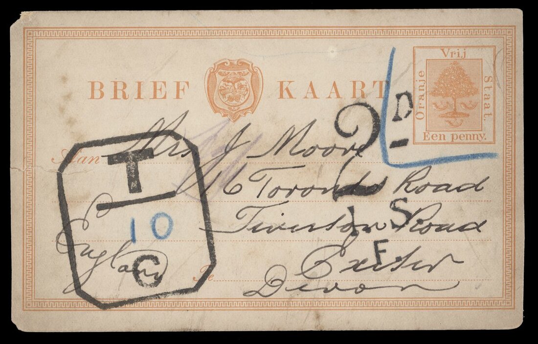 Undated 1d. stationery card to England showing blue crayon line around stamp impression indicating that it was invalid, showing large and most unusual boxed
