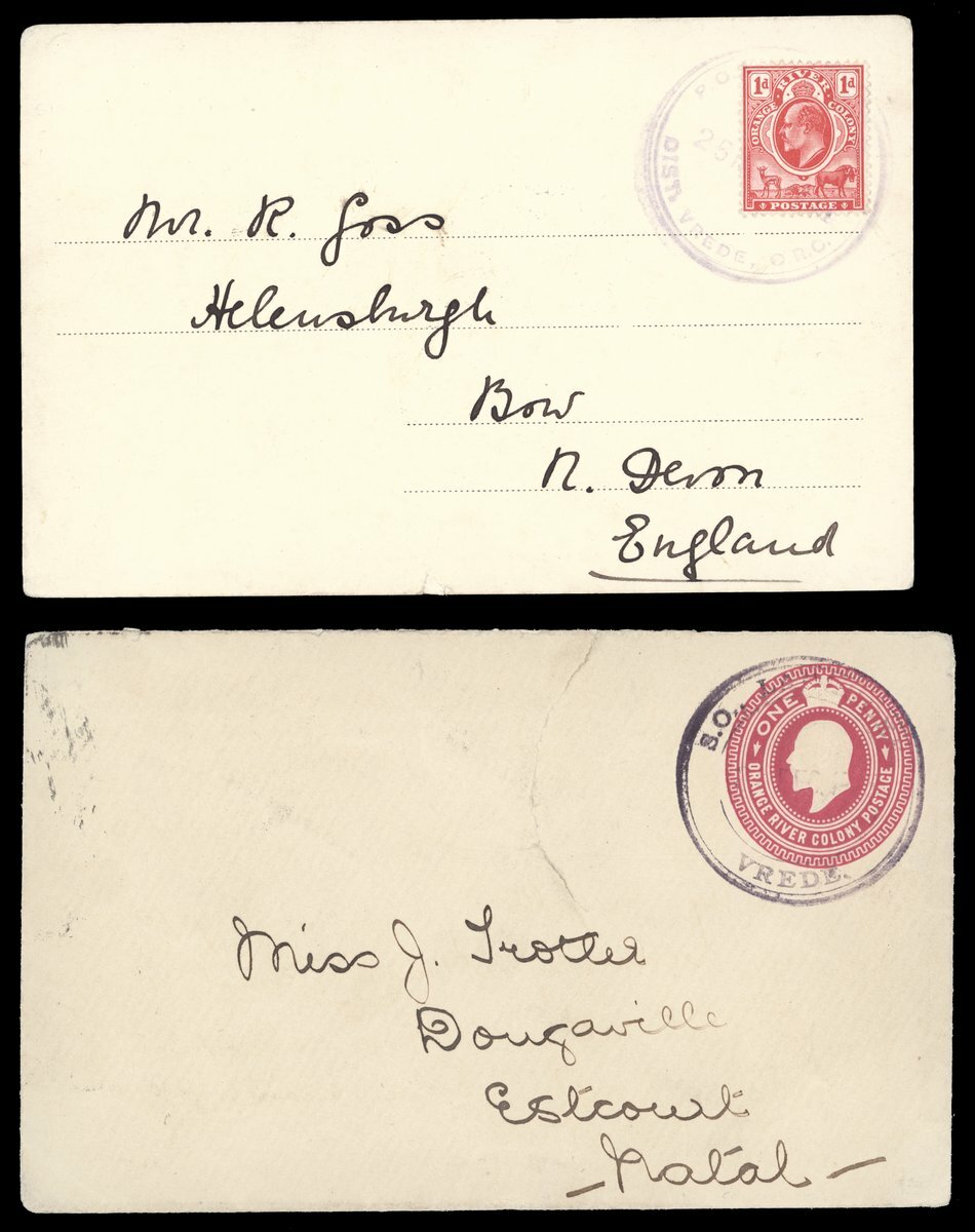 1904-06 1d. stationery envelopes (2), picture postcards (5) franked at ½d. or 1d. (4) and a large part front franked at 1d., variously addressed and showing datestamps of Aberfeldy, Essex, Langhoek, Mushroom Valley, Stillewoning, Tweespruit and Welgelegen; quality of strikes very mixed