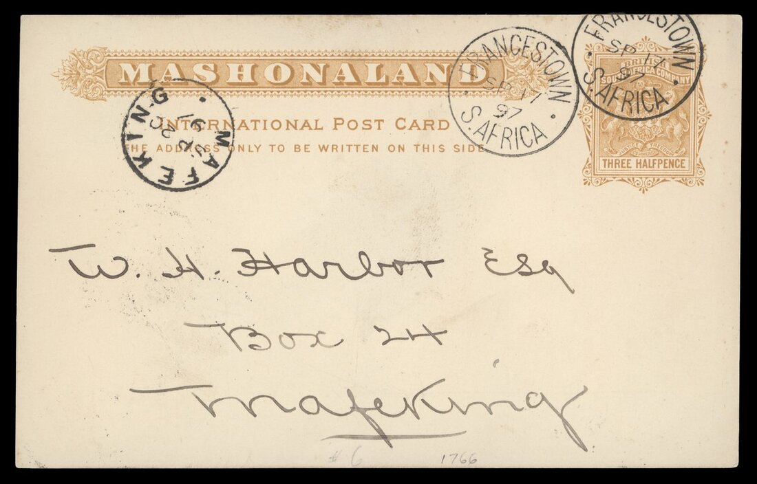 1897 (17 Sept.) Mashonaland 1½d. card to Mafeking, cancelled by