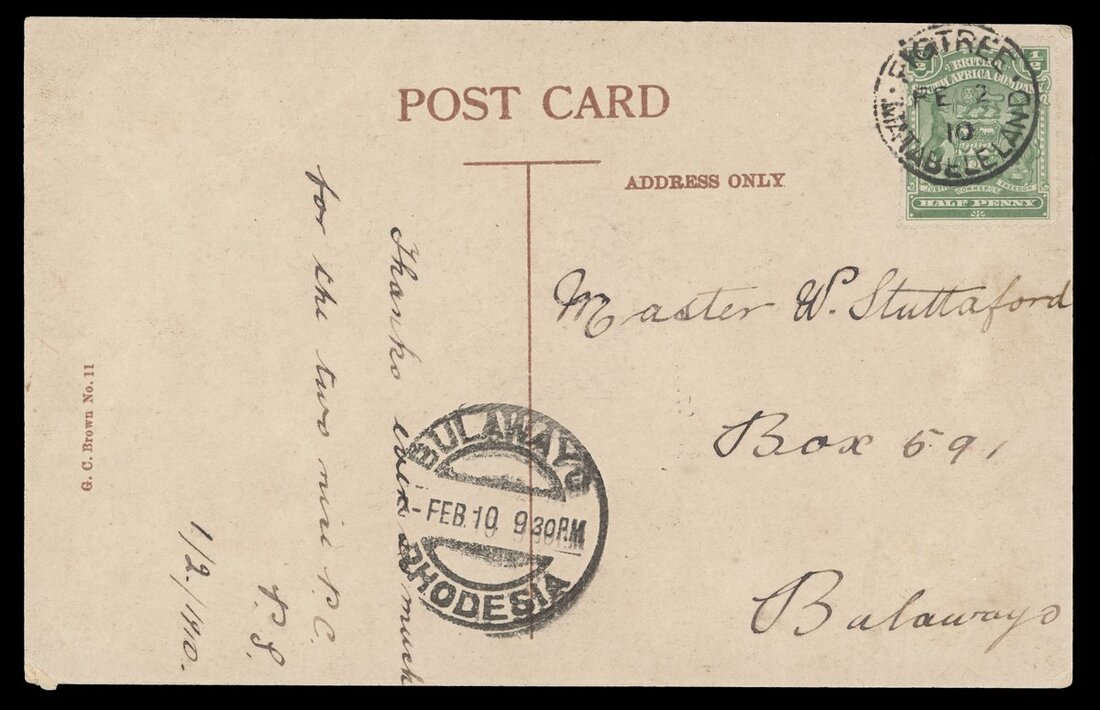 1910 (2 Feb.) picture postcard to Bulawayo, bearing 1908 Arms ½d. tied by