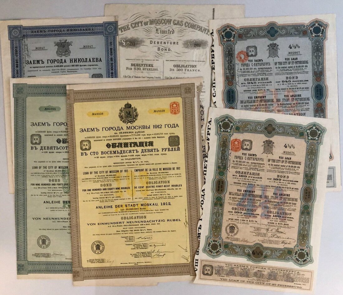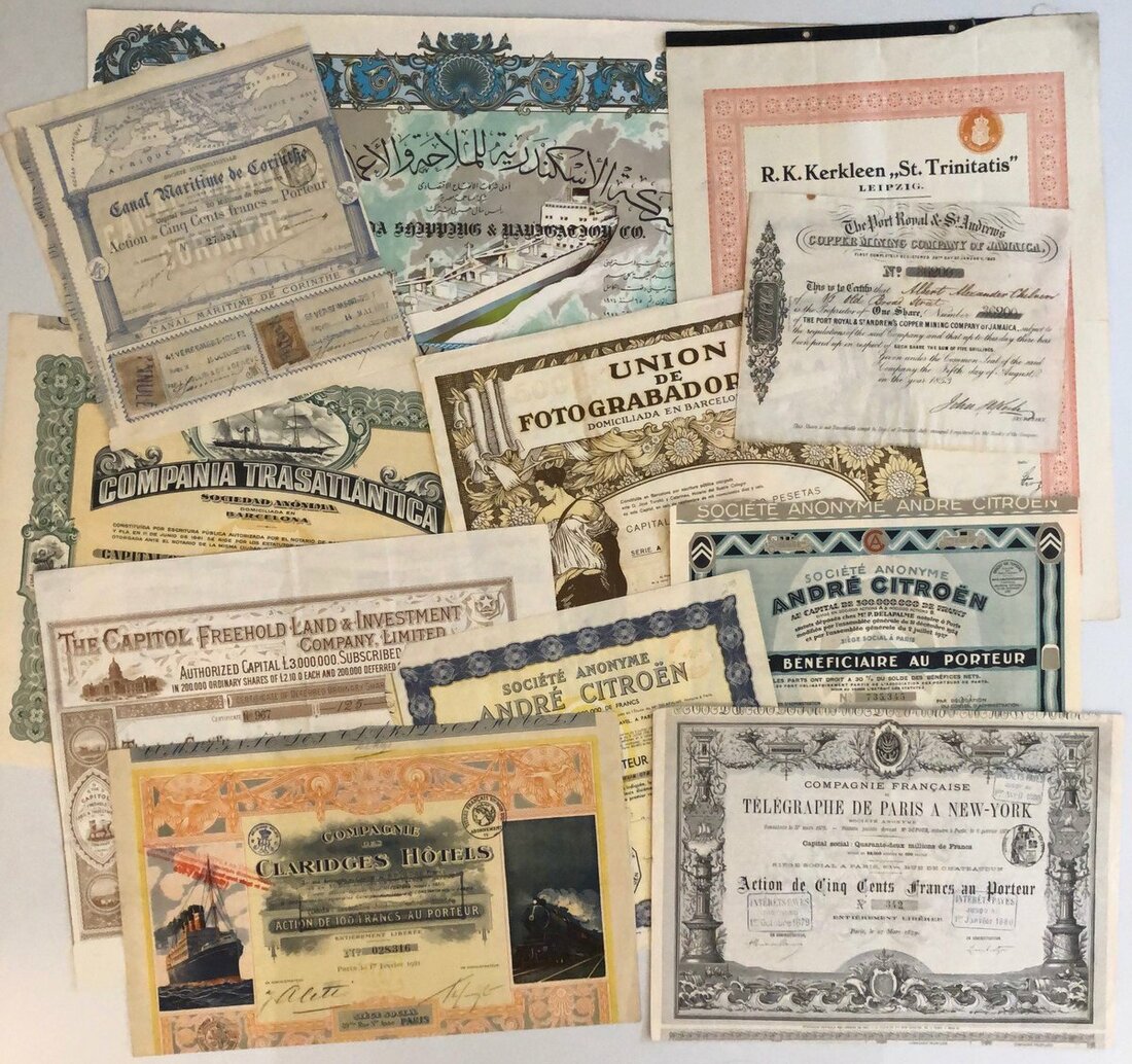 Collection of Bonds and Shares. 35 different cerificates including from South Africa, Rhodesia, Russia, France and Jamaica including some very useful pieces. Includes City of Moscow Gas Company, debenture, 1866. See selection of images for details. Many VF and EF (35).