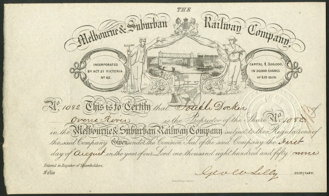 Australia: Melbourne & Suburban Railway Co., £10 share, 185[9], #1082, vignette of steam train about to cross a bridge flanked by a surveyor and a navvy, plan of the route below, black on thick paper. Built a line from Melbourne City centre to Richmond, Burley and Hawthorn, later extending to Camberwell, Lilydale and Healesville by 1889. Acquired by Government controlled Victorian Railways. EF.