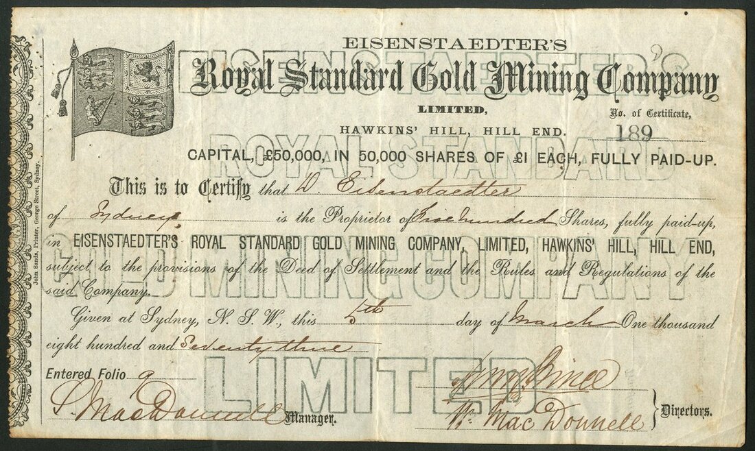 Australia: Eisenstaedter's Royal Standard Gold Mining Company Ltd., Hawkins' Hill, Hill End, £1 shares, 18[73], #189, vignette of Royal Standard (flag), black with pale blue underprint. One of the 600 or so companies formed during the 1872 mining boom. VF.