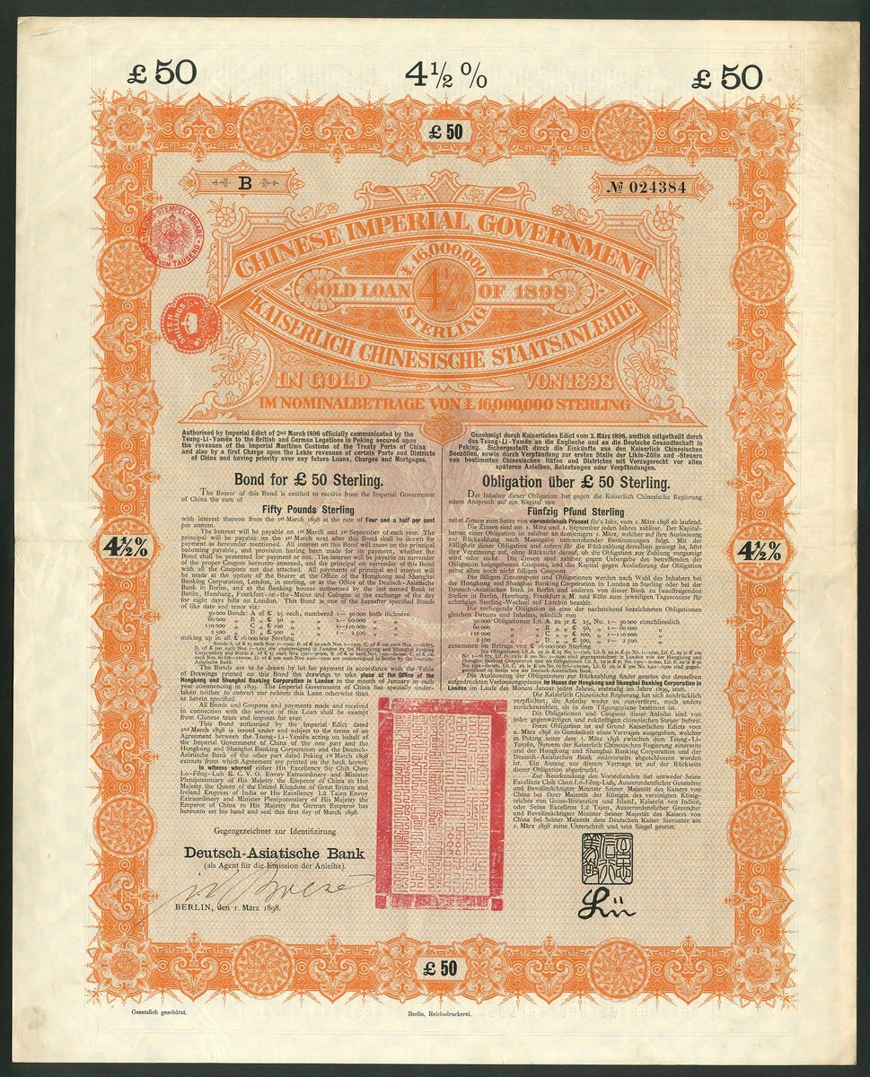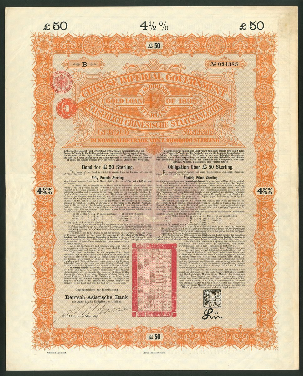 China: 1898 4½% Gold Loan, a pair of £50 bonds, issued by the Deutsch-Asiatische Bank, #24384 and 24385, large format, orange and black with coupons. In lovely well above average condition VF-EF and scarce thus (2).