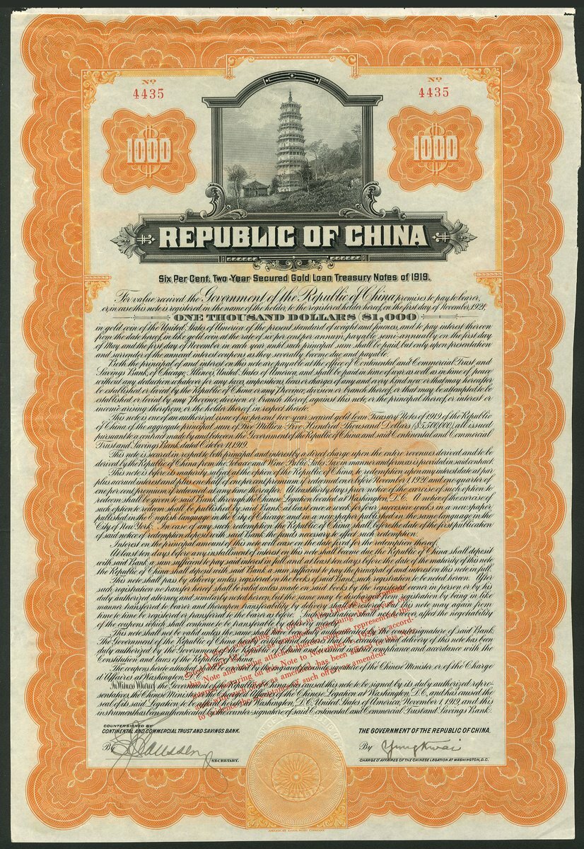 China: 1919, 6% Two-Year Secured Gold 'Chicago Bank' Loan, $1000 bond, #4435, vignette of Pagoda at top, orange and black, printed by the American Bank Note Co., with coupons and sheet of scrip certificates. GVF [R6*]