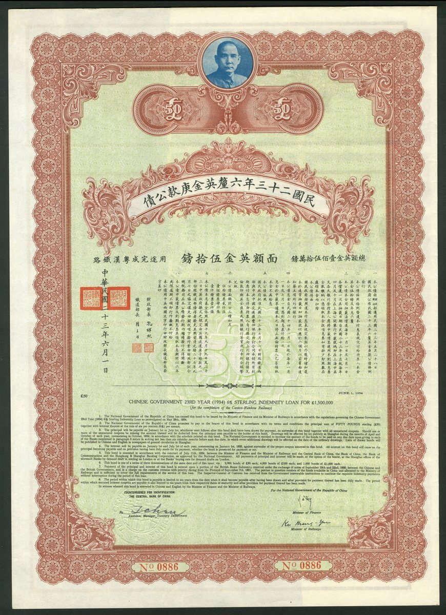 China: 1934, 6% Sterling Indemnity Loan, bond for £50, #0886, portrait of Sun Yat Sen at top, text in Chinese and English, brown and blue, green underprint, with coupons. Spike hole top left corner, and annotated top edge, AEF.