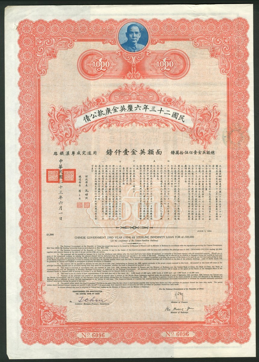 China: 1934, 6% Sterling Indemnity Loan, bond for £1000, #6096, portrait of Sun Yat Sen at top, text in Chinese and English, red and blue, pink underprint, with coupons. EF [R8*].