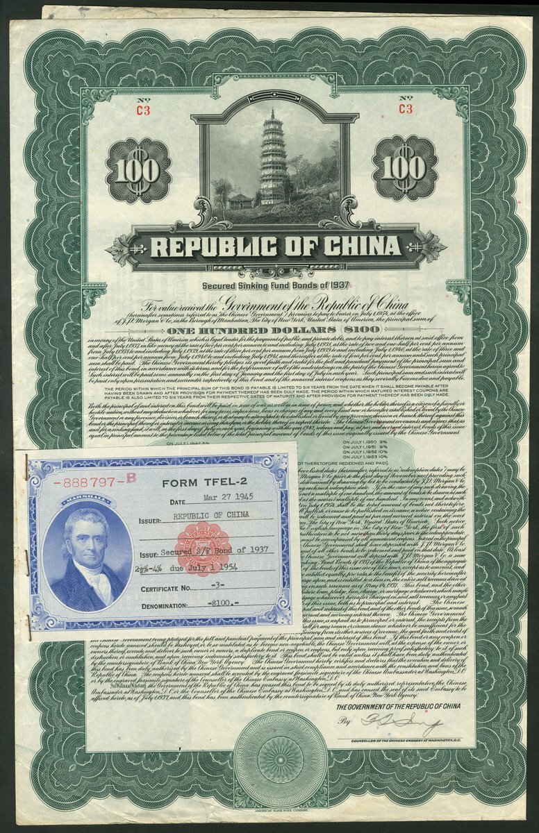 China: 1937 Secured Sinking Fund Bond (Pacific Development Loan), bond for $100, no.C3, one of only 4 known, pagoda at top, green and black, with coupons, ABNCo. printing, with certificate attached to denote American domicile of owner, GVF and very rare [R10].