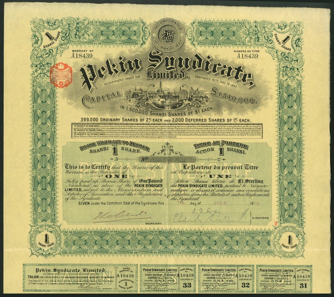 China: Pekin Syndicate Limited, bearer share certificate for 1 Shansi share of £1, 19[13], #A18439, ordinary share capital shown as 399,000 shares, vignettes of harbour scene flanked by steam train and mine, ornate border, green, yellow and black, with coupons. An Anglo-Italian company incorporated in 1897 with a view to obtaining mining concessions and to establish a note-issuing bank to finance further projects. These certificates represent the issue made following the granting of the huge concessions in Shansi Province which included coal mining and railway construction. VF.