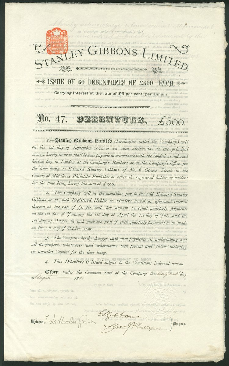 Great Britain: Stanley Gibbons Limited, 6% debenture for £500, 18[90], #47 (of only 50 issued), signed by Edward Stanley Gibbons and Charles J. Phillips as directors, large format, black, 4 pages. The name is synonymous with Stamp collecting. Investor Charles Phillips joined Stanley Gibbons in the first limited company venture which was subsequently wound up following the death of Gibbons in 1913. GVF and scarce.