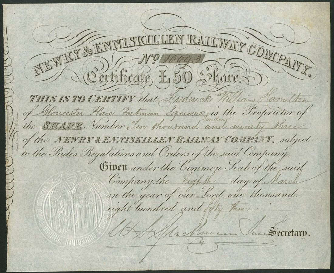 Ireland: Newry & Enniskillen Railway Company, £50 share, 18[53], #10093, black, scrollwork at left, attractive embossed seal. The line from Newry to Armagh was started by this company but completed by the newly formed Newry to Armagh Railway Company after the former got into financial difficulties. GVF.