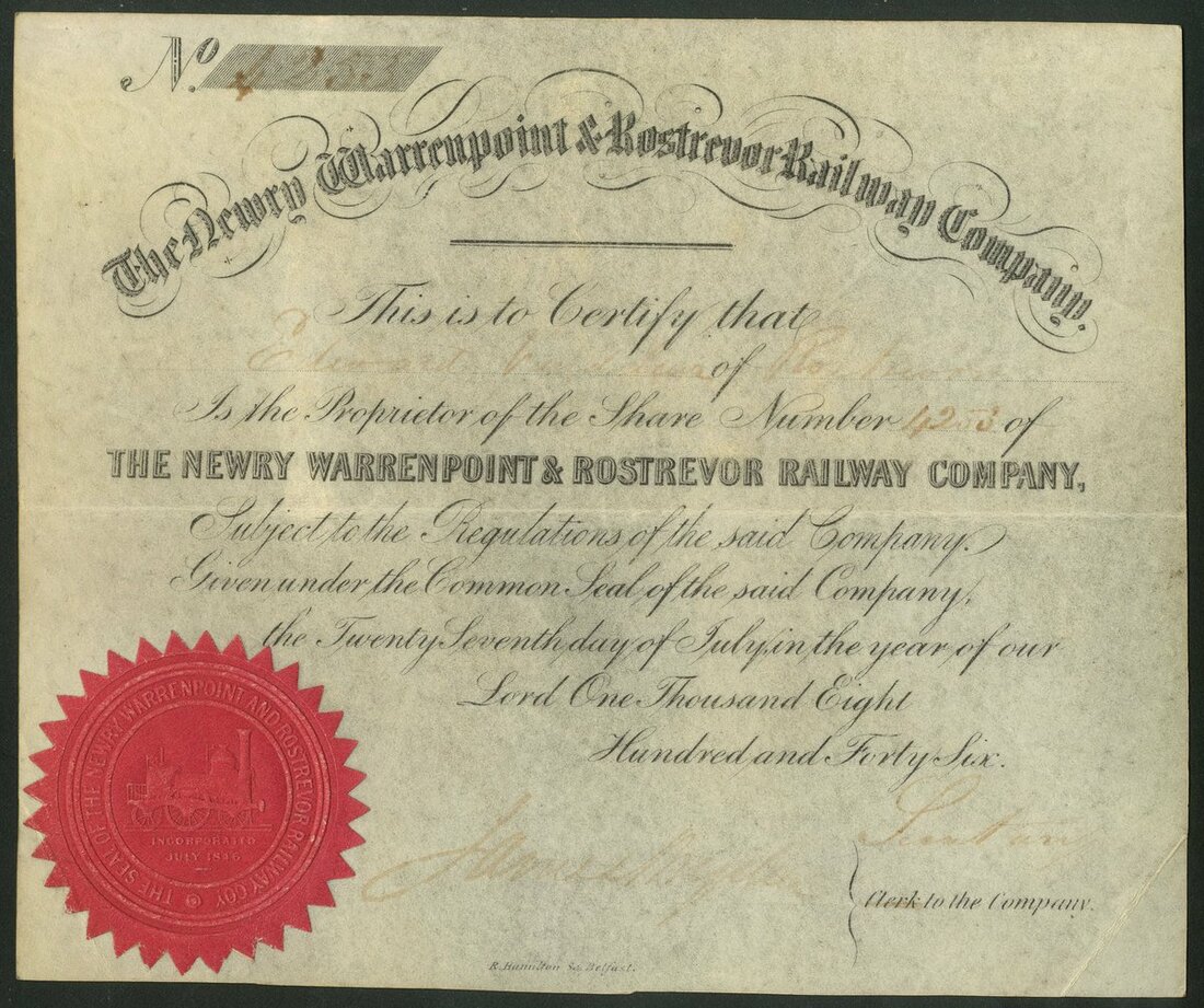 Ireland: Newry, Warrenpoint & Rostrevor Railway Company, one share, 1846, #4253, black printing, on vellum, red paper seal. Incorporated on 27th July 1846. A line running 8½ miles to connect the towns. It opened in 1849, with extensions opened in 1861 and passed to the Great Northern of Ireland in 1886. GVF.