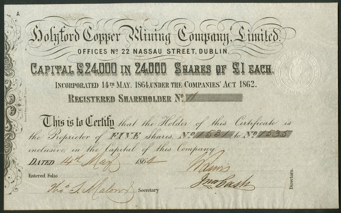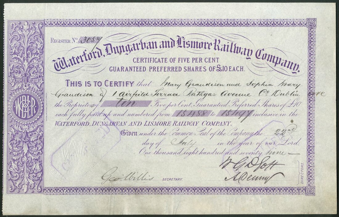 Ireland: A small collection comprising Southern Railway Company, £10 preference shares, 187[3], black, pink paper; Navan & Kingscourt Railway Company, £10 share, 18[71], black; Holyford Copper Mining Co. Ltd., 5 shares of £1, 186[4], black, and Waterford, Dungarvan and Lismore Railway Company, 5% preference shares of £10, 187[9], mauve, cancelled. VF-EF (4).