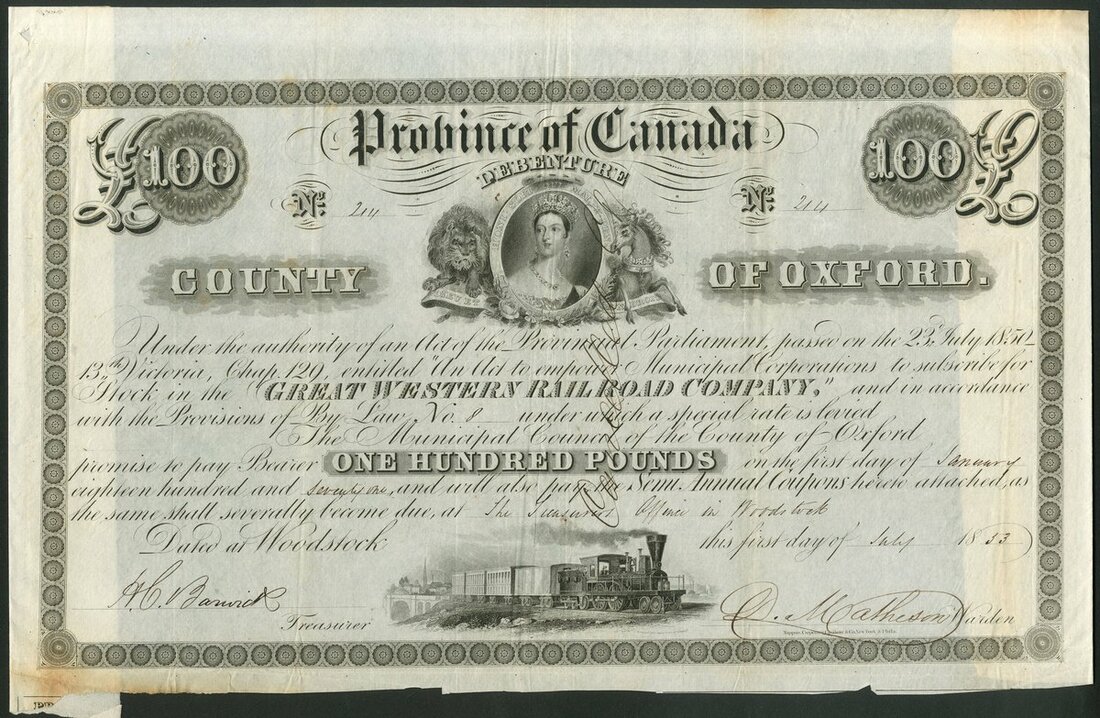 Province of Canada, Great Western Railroad Company, bond for £100 issued by the County of Oxford in aid of the Railroad, Woodstock 18[53], #214, young Queen Victoria top centre flanked by lion and unicorn, steam train at bottom, black, all coupons repaid, cancelled. VF and scarce.