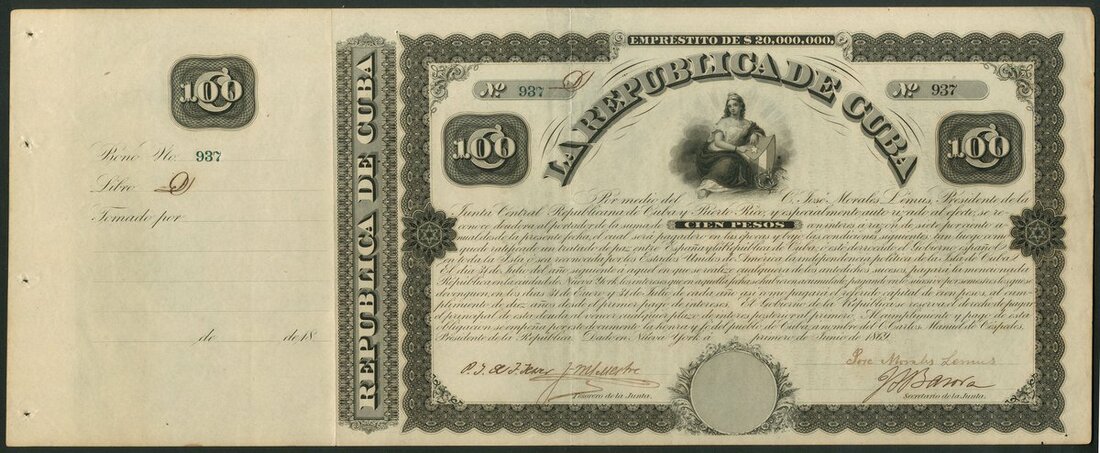 Republic of Cuba, 'Liberty' Loan, 1869, bond for $100, #937, issued in New York, signed by Jose Morales Lemus, vignette of 'Liberty' top centre, ornate border, black, text in Spanish with English translation on reverse. Loan raised in New York to fight the 10-years war against Spanish rulers between 1868 and 1878 which was unsuccessful. Two further wars ensued culminating in the Spanish American War of 1898 when Spain lost its control over Cuba. Jose Morales Lemus was a wealthy lawyer and Independence figure who died in 1870. VF and rare.