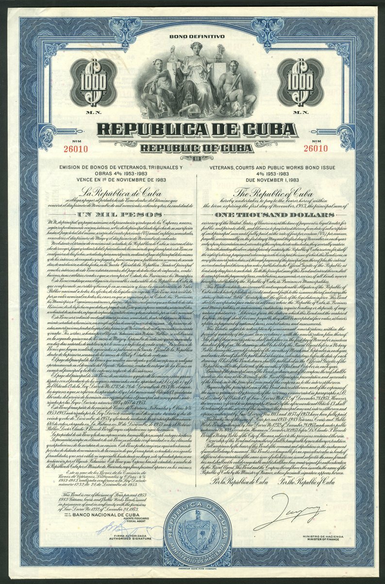 Republic of Cuba: Veterans, Courts and Public Works 4% Loan, 1953-83, bond for $1000, #26010, allegorical figures at top, ornate border, blue and black, printed by the American Bank Note Co., with coupons. VF and NOT cancelled.