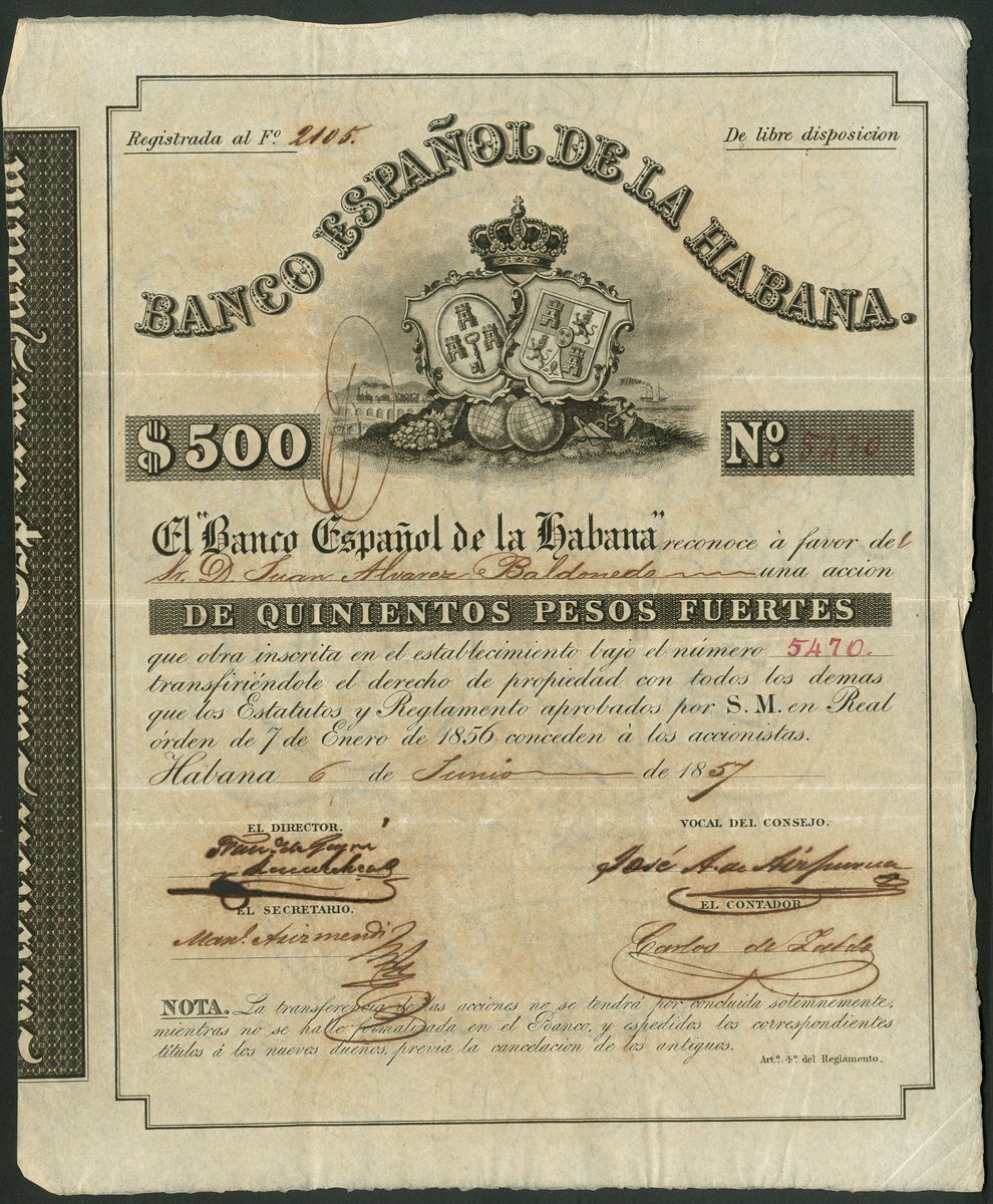 Cuba: Banco Español de la Habana, one share of pesos, 18[57], #5470, attractive printing with coats of arms top centre, black. Lightly toned paper, VF and scarce.
