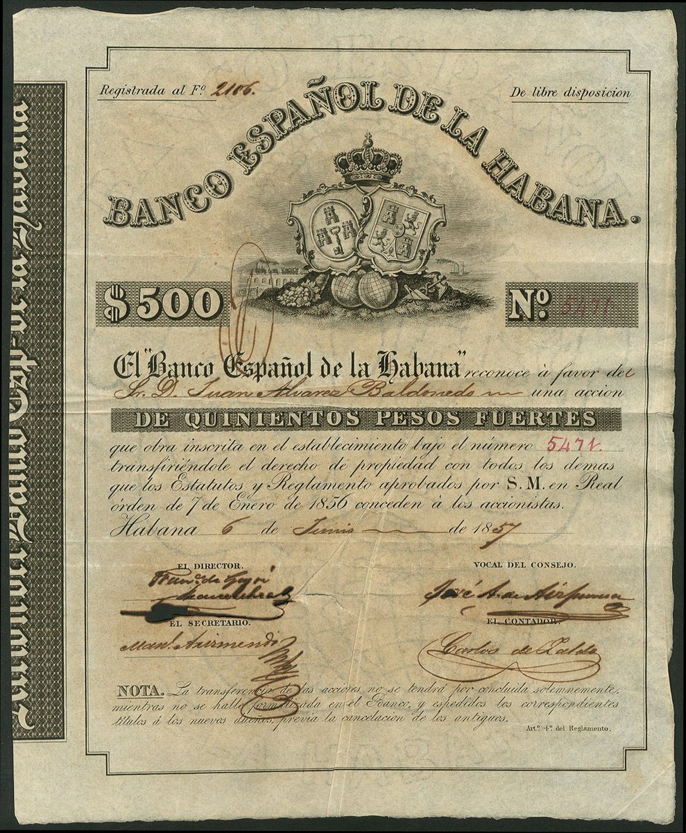 Cuba: Banco Español de la Habana, one share of pesos, 18[57], #5471, attractive printing with coats of arms top centre, black. Lightly toned paper, VF and scarce.