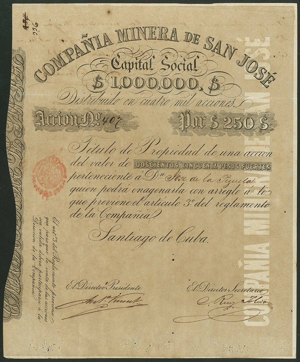 Cuba: Compañia Minera de San José, 250 peso share, undated but with 1853 endorsement on reverse, #407, black, buff underprint. Some pinholes at bottom edge, VF.