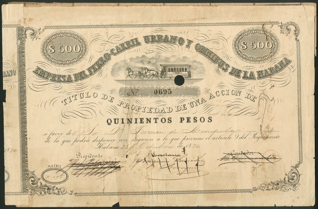 Cuba: Ferro-Carril Urbaqno y Omnibus de la Habana, 500 peso share, 18[76], #0695, horse drawn tram at top, black. Ink and hole cancelled, reglued to counterfoil. A little brittle with a few edge tears and slight ink burning, AVF.