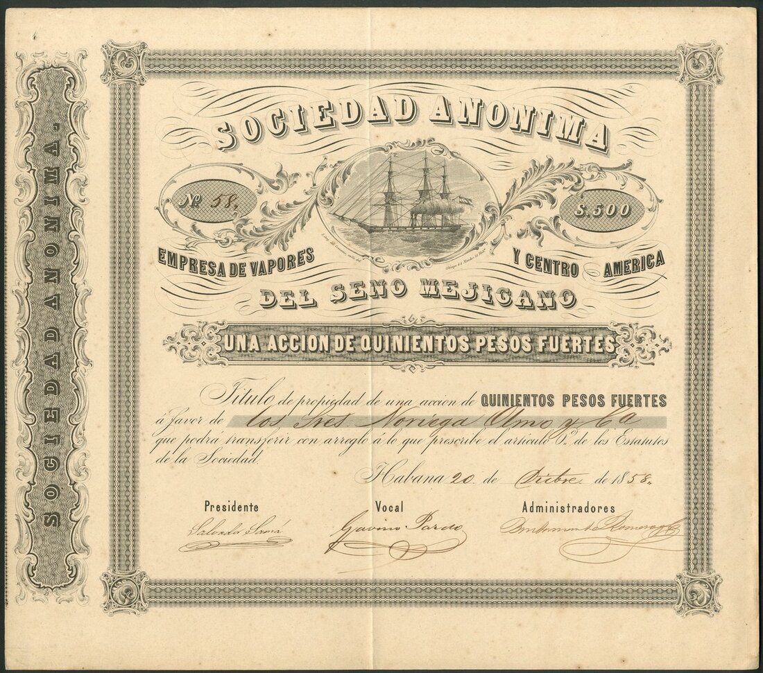 Cuba: Empresa de Vapores y Centro America del Seno Mejicano, 500 peso share, Havana 18[58], #58, attractive piece with sail assisted steamship at top, black. GVF and scarce.