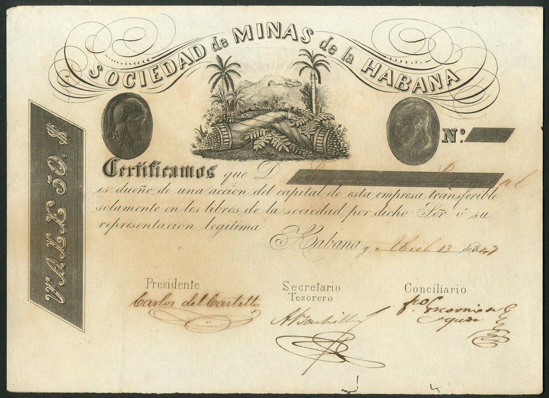 Cuba: Sociedad de Minas de la Habana, 50 peso share, 18[47], #(too feint to see), small format, vignettes of cornucopia and palm trees, black. GVF.