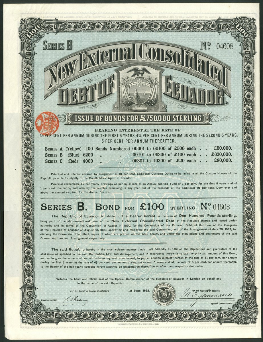 Ecuador: New External Debt, 1892 4½-5% Loan, bond for £100, #4608, large format, blue and black, with coupons, NOT cancelled. EF and rare.